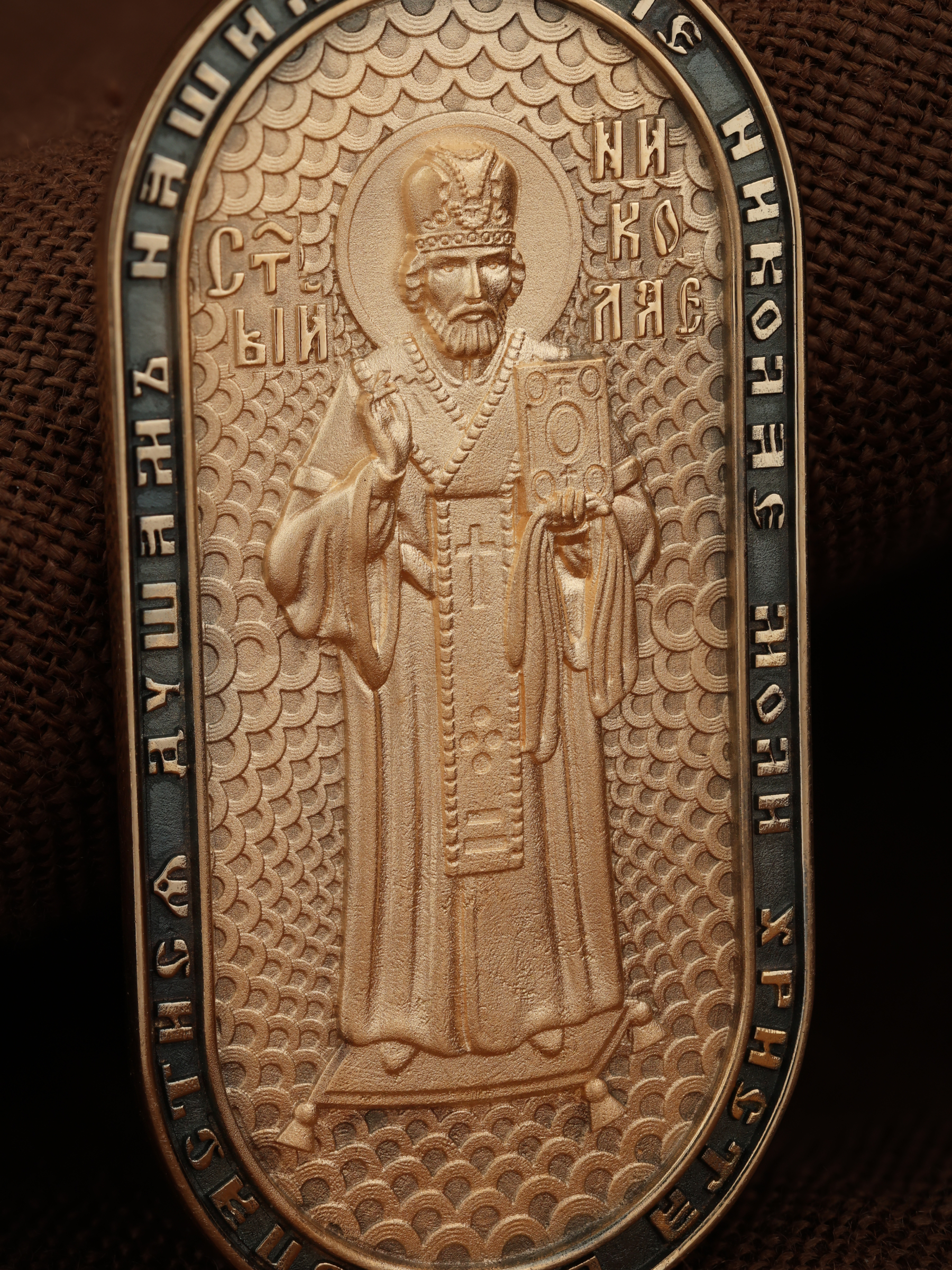 На оборотной стороне изображен Святой Николай Чудотворец, которого еще называют Николай Угодник — помощник в делах, покровитель учащихся, утешитель обиженных и нуждающихся, целитель самых страшных и тяжелых недугов, предстатель и молитвенник за людей перед Богом. Также Святитель Николай Чудотворец известен своими молитвами за путешественников, когда непрестанный ветер и бушующие волны утихают и корабль заходит в спокойную гавань. По контуру написана молитва: «Отче, Николай, моли Христа Бога спастися душам нашим». На кулонном кольце помещено изображение Спаса Нерукотворного.