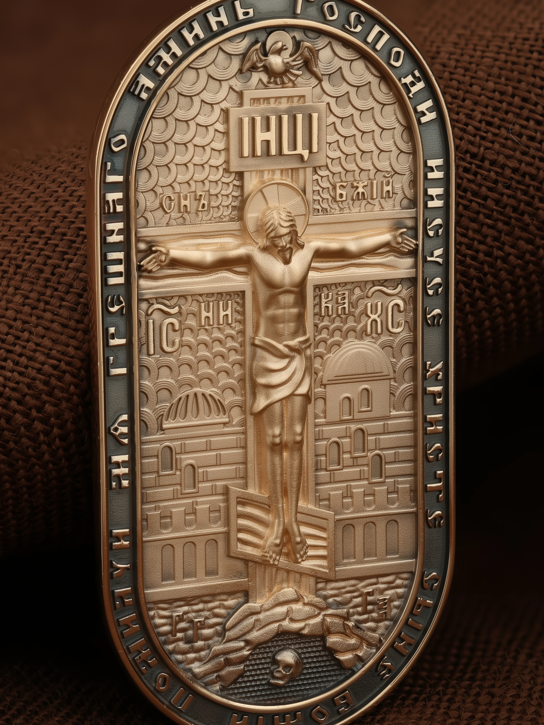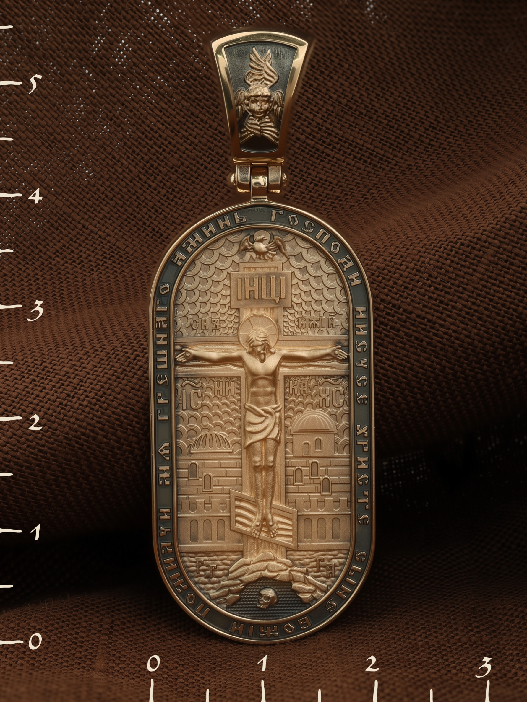 Центральную часть лицевой стороны занимает Распятие Христа — образ жертвы, принесенной Господом за грехи людей. Именно ко Христу, сошедшему на землю ради нашего спасения, возносятся все молитвы. Рядом с Его образом помещены слова — «НИКА» (греч. — Победитель) и «СЫН БОЖИЙ». Эти слова характеризуют Господа как Великого Архиерея, победителя смерти. Также Распятие сопровождается надписями, олицетворяющими Христа — это святое имя Христа «IC» (Иисус) «ХС» (Христос). Верхняя перекладина символизирует собой табличку с надписью «IHЦI» — Иисус Назарянин Царь Иудейский. Возвышение, на котором стоит Крест, символизирует гору Голгофу, на которой произошло Распятие. У подножия Креста изображают прах Адама, обозначенный черепом. На кулонном кольце изображен шестикрылый Серафим — самый приближенный к Господу Ангел. По контуру образка написана молитва: «Господи Иисусе Христе, Сыне Божий, помилуй мя грешного. Аминь»