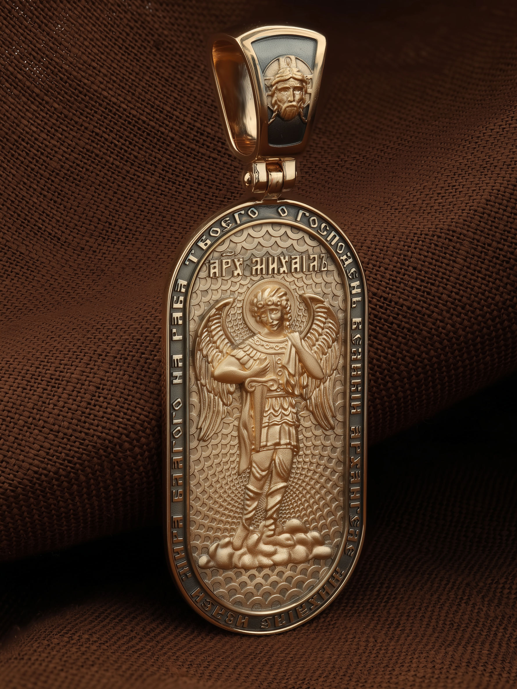 Основой композиции оборотной стороны является ростовое изображение Архангела Михаила — Архистратига всех Небесных Воинств. Он ведет непримиримую войну против сил зла, охраняет райские врата и защищает души людей. По контуру написана молитва: «О, Господень Великий Архангеле Михаиле, излей мира благого на раба Твоего». На кулонном кольце изображен Спас Нерукотворный — Символ вочеловечившегося Божества.