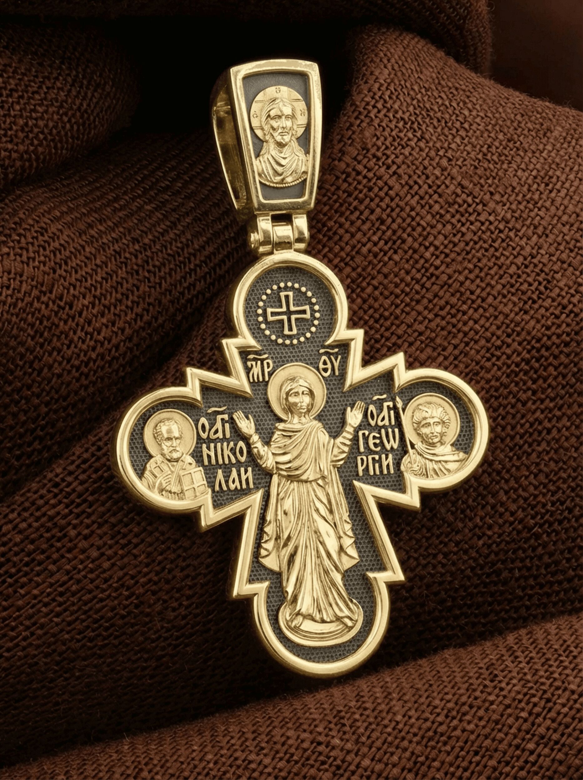 Центральную часть оборота креста занимает икона Божьей Матери «Нерушимая Стена». Особенно почитается эта икона как помощница в тяжелых жизненных ситуациях, как защитница от врагов и спасительница в смертельной опасности. Слева от Божьей Матери расположен образ Святого Николая Чудотворца. Ему молятся, отправляясь в путешествие, особенно по морю, просят исцеления в различных недугах, помощи в торговых делах, учебе и поисках достойного супруга. Справа — святой великомученик Георгий Победоносец († 303), один из наиболее почитаемых святых в Христианской Церкви. Покровитель воинов, помощник в крестьянском труде, защитник в бедах, духовный помощник в невидимой брани с силами зла. Святой Георгий, небесный защитник, который спускается с Небес, чтобы помочь душе избавиться от гибели.