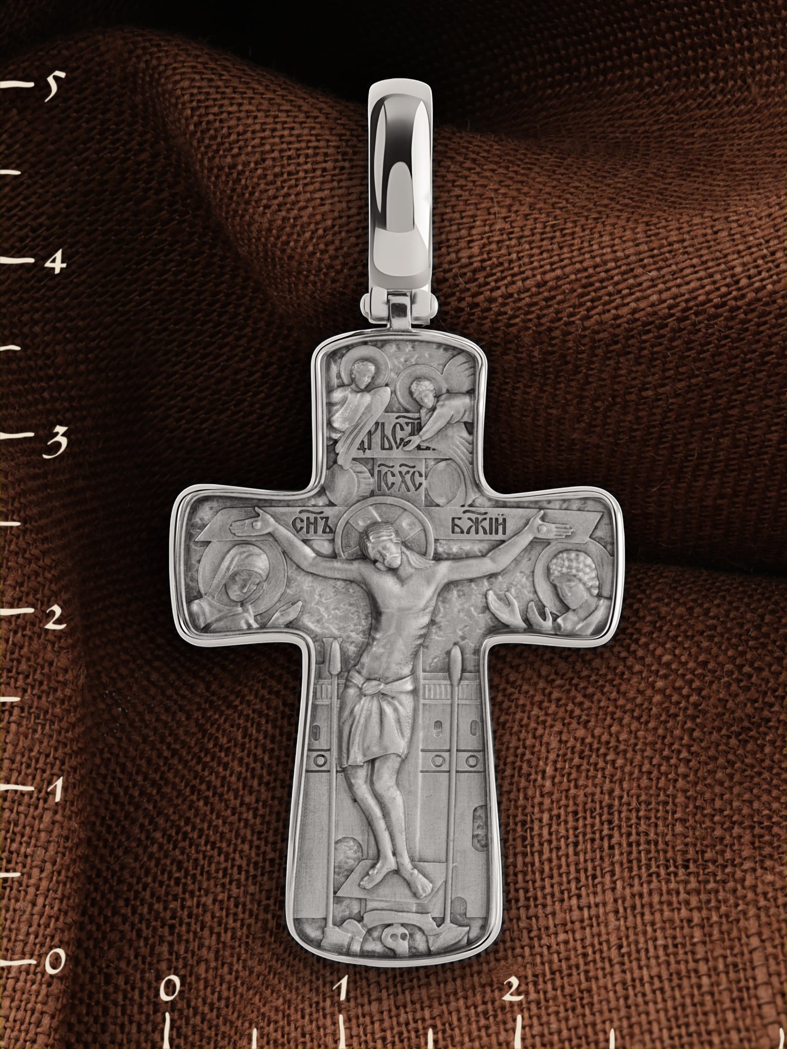 На лицевой стороне креста изображено Распятие Господа и Спасителя нашего Иисуса Христа. Крест- символ спасения и искупления рода человеческого, знамение победы над смертью и адом. Иисус Христос, как искупительная жертва освобождения человечества от власти греха, умер крестной смертью и в третий день воскрес. Господь сказал: кто хочет идти за Мною, отвергнись себя, и возьми крест свой, и следуй за Мною. (Мк. 8: 34). Над вершиной Распятия помещена надпись «Царь Славы». На верхней табличке, выше головы Иисуса, расположена надпись, составленная Понтием Пилатом — «IНЦI». Надпись «IС» « ХС» означает Иисус Христос и помещается на разных сторонах поперечной перекладины креста. Рядом расположена надпись «Сын Божий». Над Распятием изображены ангелы. Слева от Распятия изображена Пресвятая Богородица, справа — апостол и евангелист Иоанн Богослов, один из ближайших учеников Иисуса Христа. Крест стоит на горе камней, символизирующих Голгофу. В ее основании различается череп — это голова Адама. Вдоль креста изображены копие сотника Лонгина и трость с губкой.