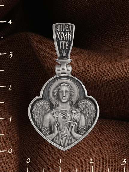 На лицевой стороне образка изображен Святой Ангел-Хранитель в виде прекрасного, светозарного юноши держащего в правой руке крест, а в левой — мечь. Ангел-Хранитель — это Ангел приставляемый Богом к человеку при крещении для охраны и помощи в добрых делах. Он невидимо находится при человеке на протяжении всей его жизни, если человек сохраняет в себе любовь к Богу и истинную веру перед Ним. Ангел-Xранитель делают для нас все, что служит к истинному нашему благу и спасению. Невидимо пребывая при нас постоянно, он, руководствуя нас ко спасению, не только по нашему желанию таинственно наставляет нас на все доброе и полезное, не только возносит наши молитвы к Богу, но еще и сам от себя охраняют и защищают нас от врагов видимых и невидимых и ходатайствует за нас пред Богом.