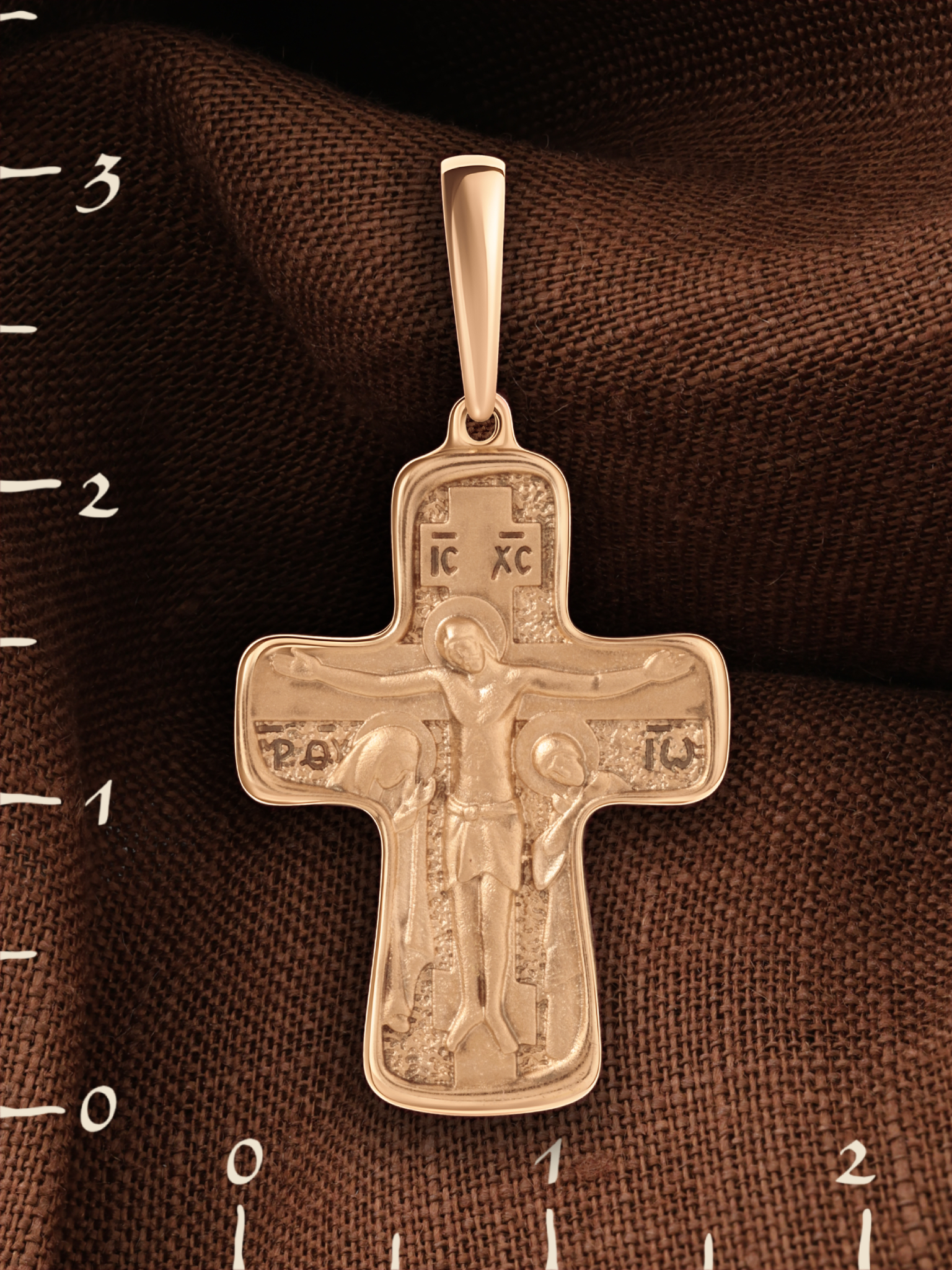 На лицевой стороне креста изображено Распятие Господа и Спасителя нашего Иисуса Христа. Крест- символ спасения и искупления рода человеческого, знамение победы над смертью и адом. Иисус Христос, как искупительная жертва освобождения человечества от власти греха, умер крестной смертью и в третий день воскрес. На верхней табличке, выше головы Иисуса расположена надпись «IС» « ХС», которая означает Иисус Христос. Слева и справа от Распятия стоят оплакивающие Господа Пресвятая Богородица и возлюбленный ученик Иисусов, Иоанн Богослов. По преданию, увидя, что они горько плачут, Иисус сказал Матери Своей: «Жено! Се сын Твой!» Потом сказал ученику: «Се мати твоя». С этого времени Иоанн взял Матерь Божию к себе, и Она жила в его доме до самой смерти.