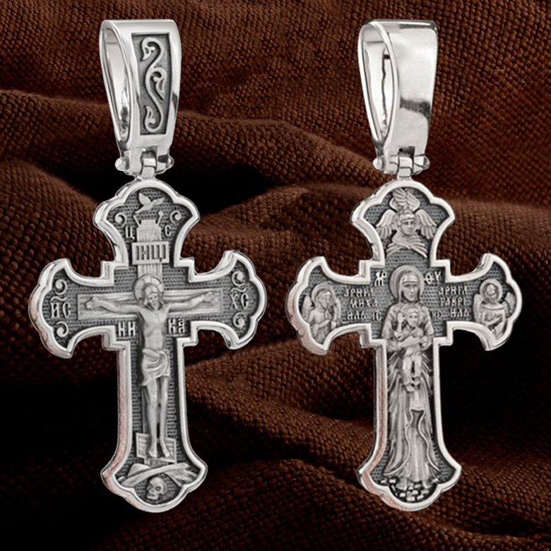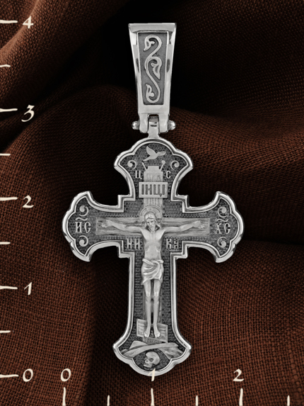 На лицевой стороне креста изображено Распятие, потому что это орудие казни Иисус Христос сделал орудием победы над грехом и смертью. Своими страданиями Он искупил грехи человечества, умерев и сошествовав во ад, победил сатану, освободил души праведников от вечной смерти и открыл им небесные врата рая. Жертва Христа сделала возможным спасение для каждого человека. На православном кресте Христос не умирает, а свободно простирает руки, ладони Иисуса открыты, будто он хочет обнять все человечество, даря им свою любовь и открывая путь к вечной жизни.