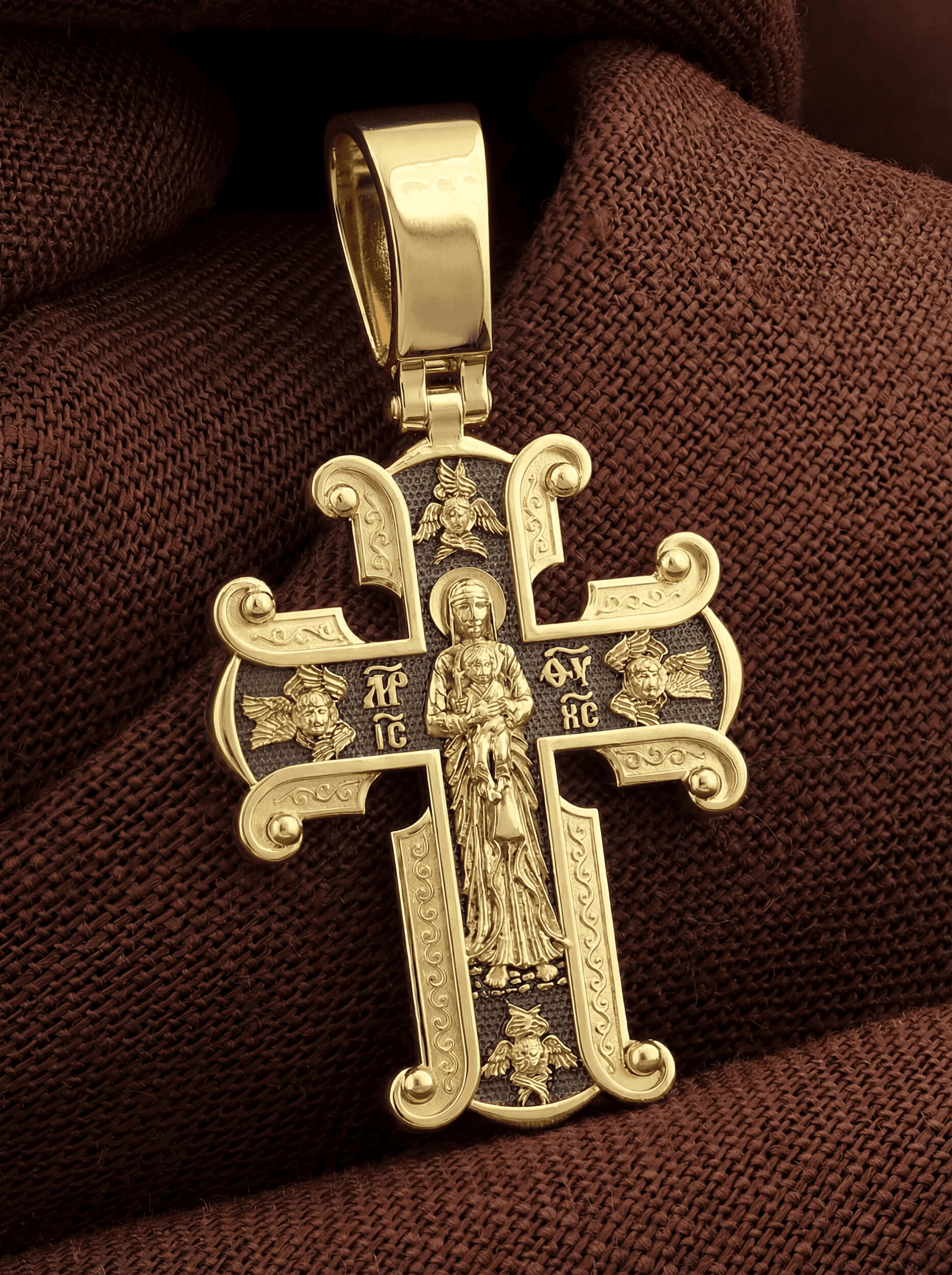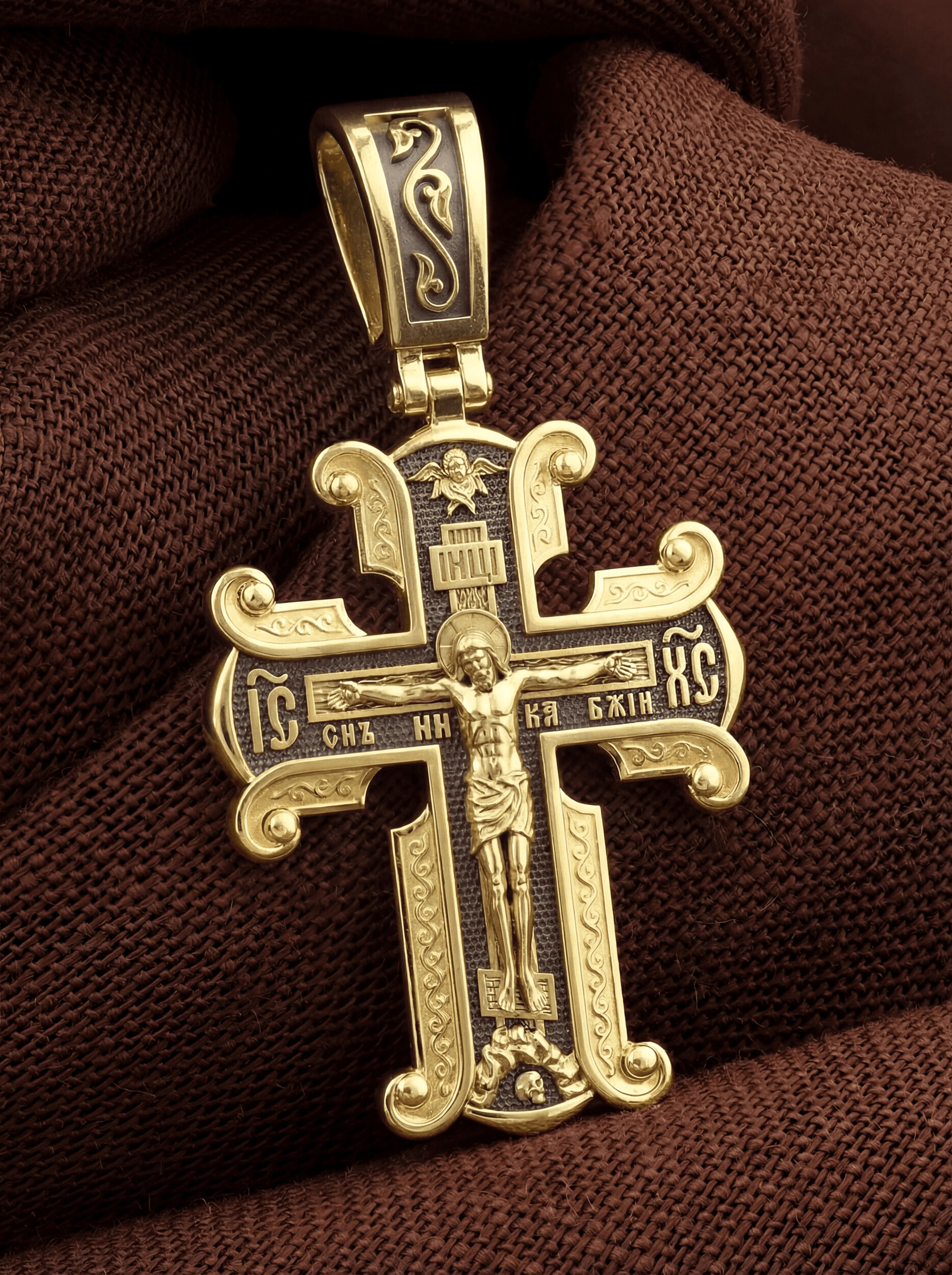 На лицевой стороне необычной формы нательного креста мы видим распятие Господне. Сам крест украшен плетением полурастительной тематики и золотым ободком, заканчивающимся завитками. На ухе с лицевой стороны надпись — Царь Славы. Под ней — шестикрылый огненный серафим, и буквы «IНЦI», означающие Иисус Назорей Царь Иудейский. С обеих сторон горизонтальной перекладины надписи — монограмма святого имени Христа — «ИС ХС», а под ней — «НИКА» (Победитель) и «Сын Божий». В подножии мы видим изображенную гору Голгофу в виде скалистой горки с Главой Адамовой в пещере.