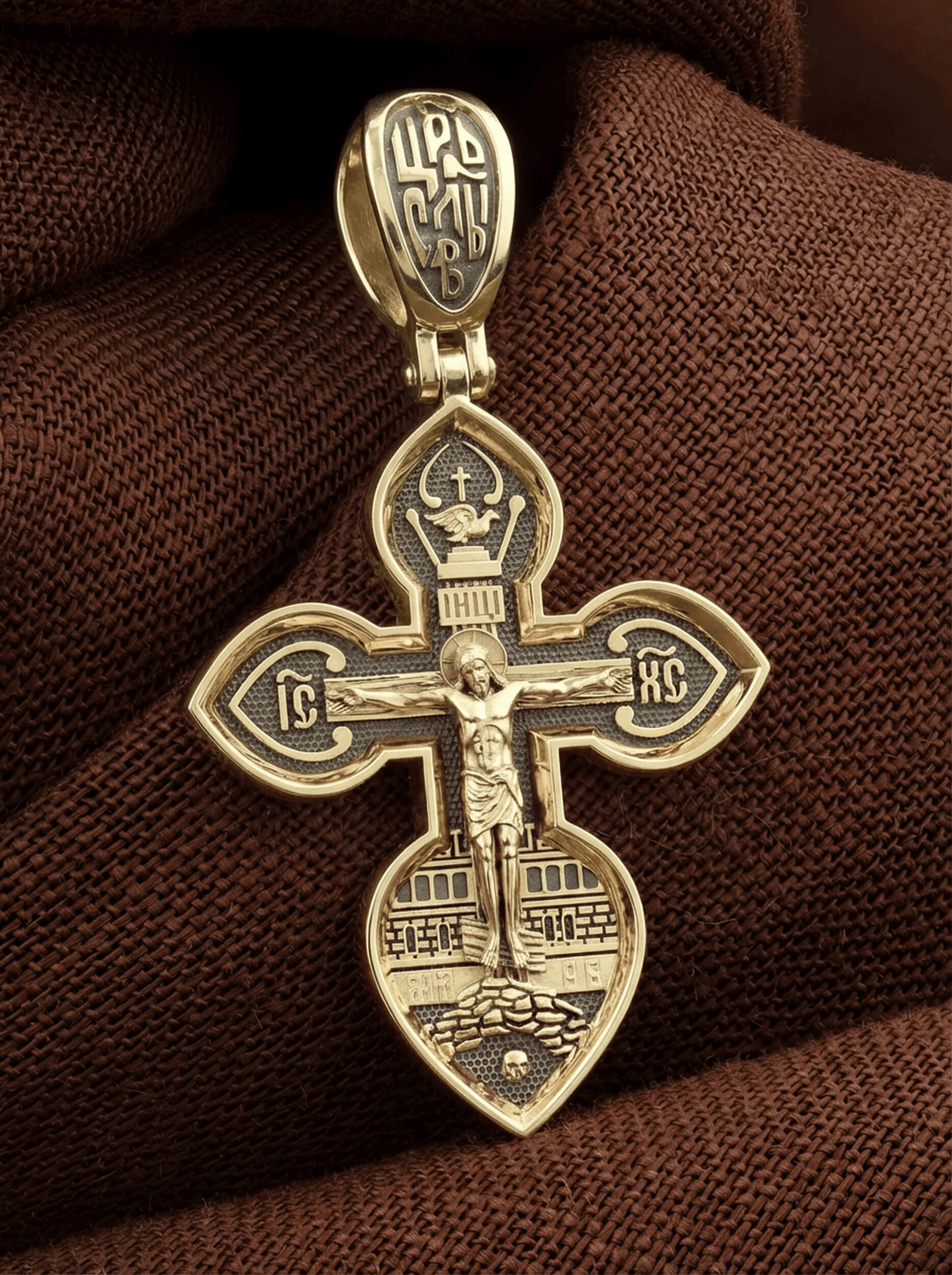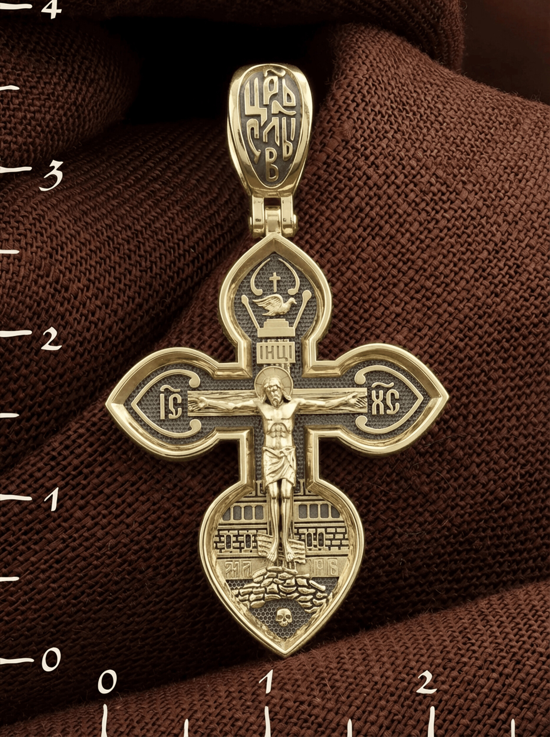 На лицевой стороне нательного креста изображено Распятие Господа нашего Иисуса Христа. Крест Господень стоит на небольшом каменистом возвышении, символизирующем гору Голгофу, которая обозначена буквами МЛРБ (Место Лобное Рай Бысть). Над головой Господа на поперечной перекладине написано «ИНЦИ», что символизирует табличку, которая была прибита к Кресту, с надписью «Иисус Назорей Царь Иудейский».По сторонам основной перекладины расположены позолоченные рельефные инициалы Христа «ИС ХС».