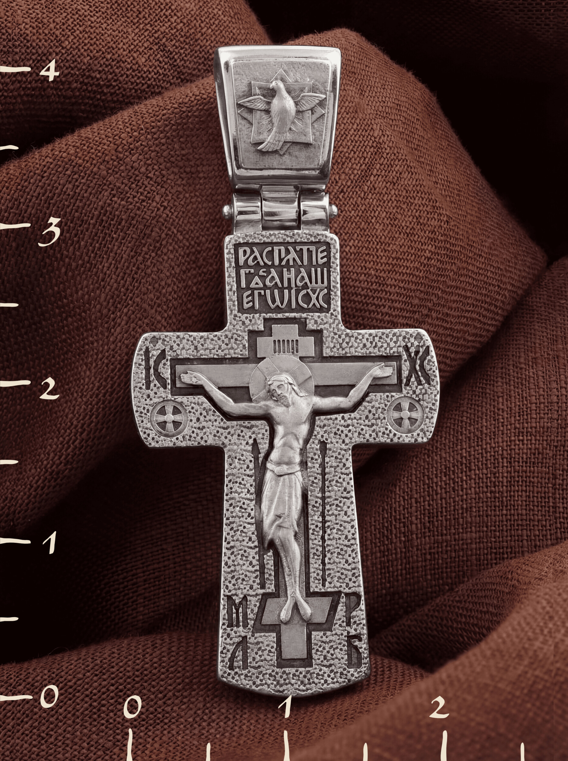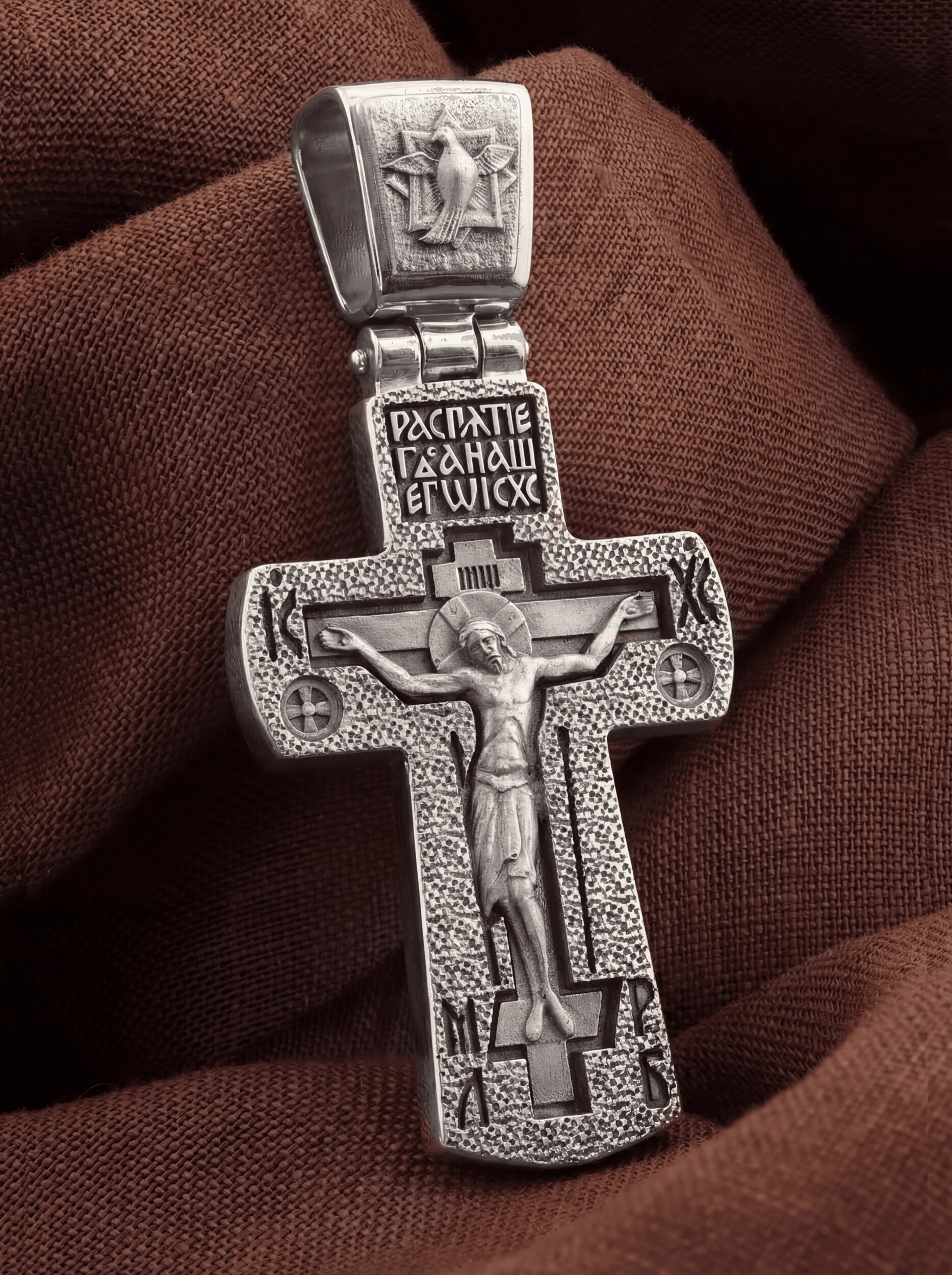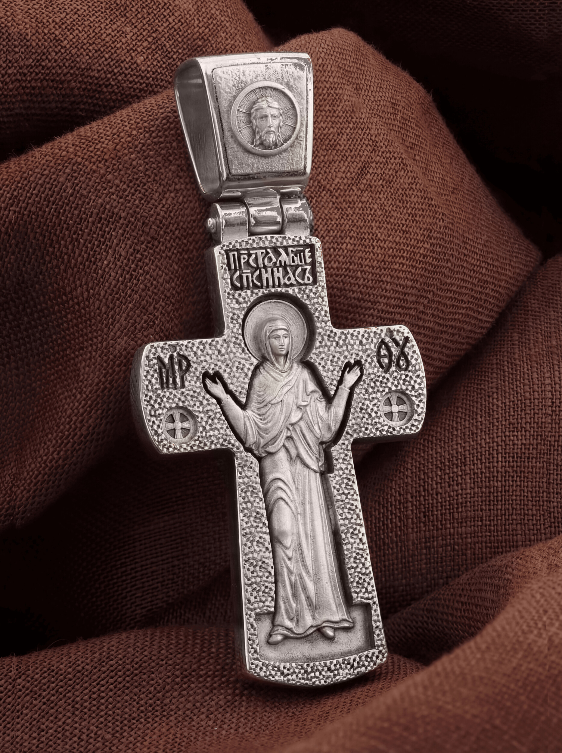 На лицевой стороне креста изображено Распятие Иисуса Христа. Господь представлен свободно покоящимся на кресте с простертыми руками и как бы обнимающим всю Вселенную. Он — Спаситель, искупивший грехи мира, «поправший смертию смерть» и призывающий к Себе «все концы земли». Верхняя перекладина символизирует титло — табличку, на которой, согласно Евангелию, было начертано: Иисус Назорей Царь Иудейский (IНЦI). Также Распятие сопровождается надписями, олицетворяющими Христа. Это святое имя Христа «IC» (Иисус) «ХС» (Христос). Возвышение, на котором стоит Крест, символизирует гору Голгофу, на которой произошло Распятие. У подножия пишутся четыре буквы «МЛ» и «РБ» — «Место Лобное» и «Рай Бысть».