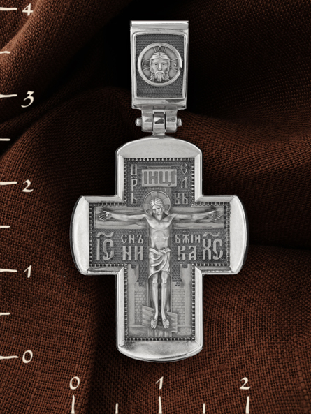 На лицевой стороне креста изображено Распятие Господа и Спасителя нашего Иисуса Христа, отдавшего Себя на смерть, для искупления грехов мира. Крест является символом жертвенной любви Всеблагого Бога к падшим людям, всепобеждающим духовным оружием христиан, основанием и средоточием церковной жизни. Над вершиной Распятия помещена надпись «Царь Славы». На верхней табличке, выше головы Иисуса, расположена надпись, составленная Понтием Пилатом — «IНЦI». Она означает «Иисус Назорей, Царь Иудейский». Распятие сопровождается каноническими надписями. Надпись «IC» «ХC», означает Иисус Христос, надпись «НИКА» (греч. Победитель) и словосочетание «СЫН БОЖИЙ», что означает божественную природу Иисуса Христа, помещаются на разных сторонах поперечной перекладины креста. Сзади — Иерусалимская стена. На кулонном кольце изображен Спас Нерукотворный — образ Господа и Спасителя нашего Иисуса Христа, чудесно отпечатавшийся на плате, котором Христос вытер свой лик.