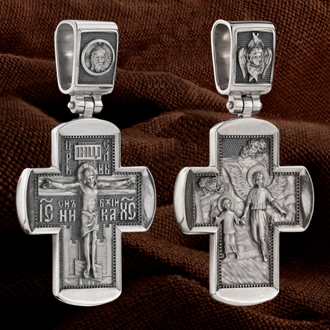 На оборотной стороне креста изображен святой Ангел-Хранитель, ведущий человеческую душу, которая представлена в виде ребёнка. Ангел-Хранитель — это Ангел приставляемый Богом к человеку при крещении для охраны и помощи в добрых делах. Он невидимо находится при человеке на протяжении всей его жизни, если человек сохраняет в себе любовь к Богу и истинную веру перед Ним. Ангел-Xранитель делают для нас все, что служит к истинному нашему благу и спасению. Невидимо пребывая при нас постоянно, он, руководствуя нас ко спасению, не только по нашему желанию таинственно наставляет нас на все доброе и полезное, не только возносит наши молитвы к Богу, но еще и сам от себя охраняют и защищают нас от врагов видимых и невидимых и ходатайствует за нас пред Богом. Одного лишь каждому из нас он желает — спасения души; к этому он направляет все свои заботы. И если видит нас также заботящимися о спасении, радуется, если же видит нас пребывающими в нерадении о душе своей, скорбит. Но и самый великий грешник может примириться со своим Ангелом-Хранителем посредством искреннего раскаяния в грехах и оставления их навсегда. В таком случае, по слову Писания, великая радость бывает для всех ангелов на небесах (Лк. 15:10). На кулонном кольце изображен Серафим.