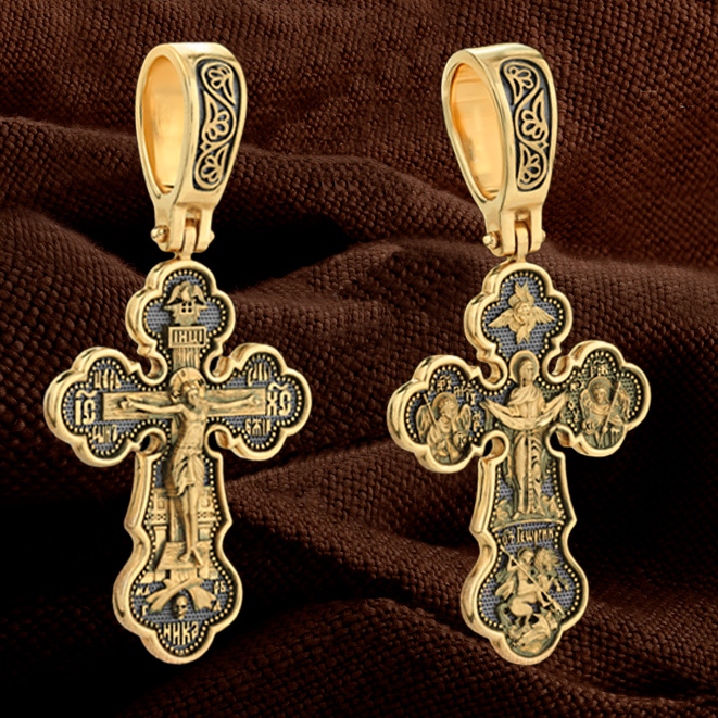 Центральную часть оборотной стороны креста украшает икона Божией Матери «Покров Пресвятой Богородицы». Праздник Покрова Пресвятой Богородицы пришел на Русь в XII веке из Византии и стал одним из самых почитаемых. Пресвятая Богородица простирает Свой молитвенный покров над всеми православными христианами и умоляет Сына своего о даровании вечного спасения каждому человеку. Над образом помещен шестикрылый Серафим. Справа помещено изображение Архангела Гавриила, слева- Архангела Михаила. На кресте внизу помещено изображение Святого Великомученика Георгия Победоносца — одного из самых почитаемых и удивительных святых. Он изображен как воитель, сидящий на вздыбленном коне и поражающий копьем огнедышащего змея. Змей символизирует собою сатанинские силы.