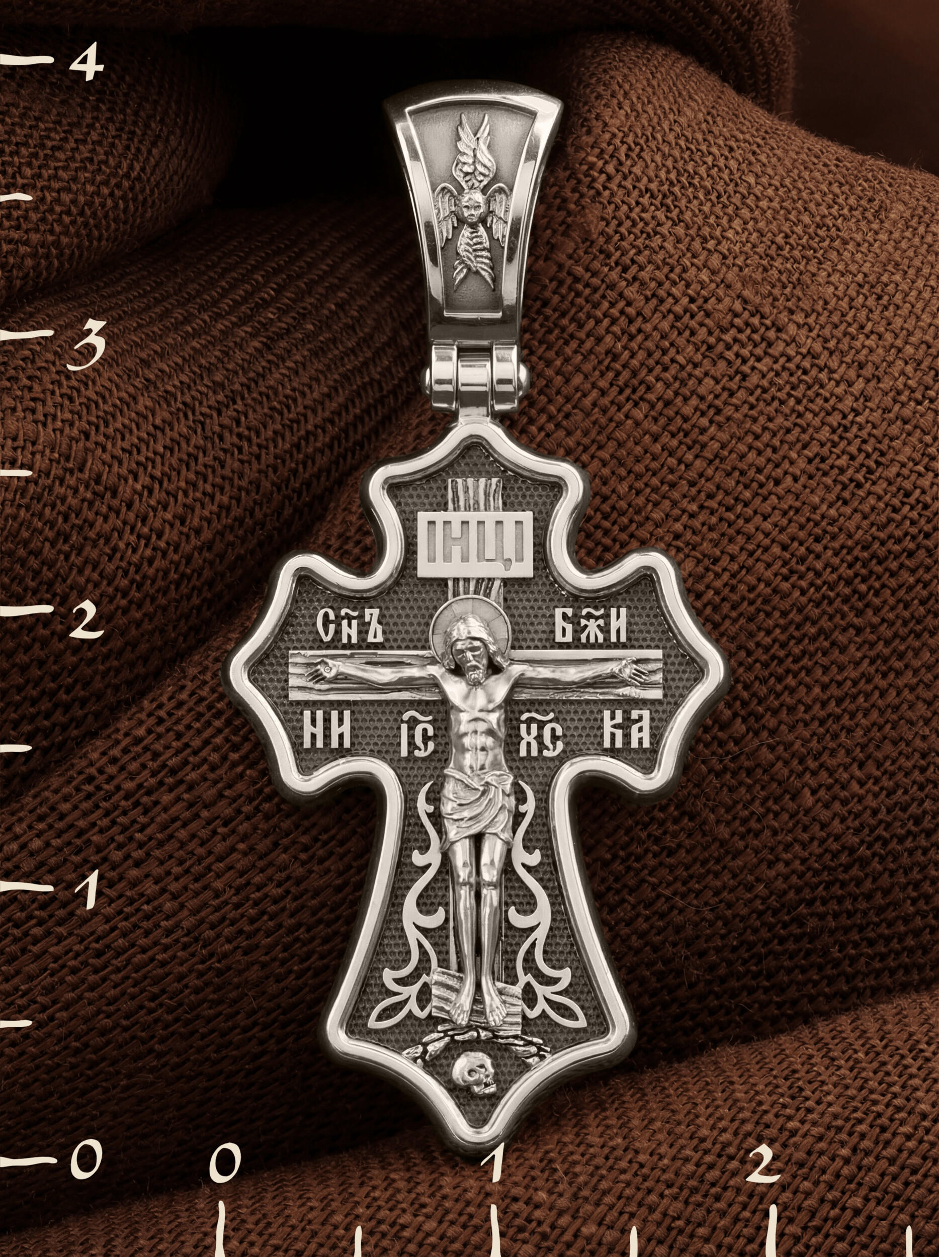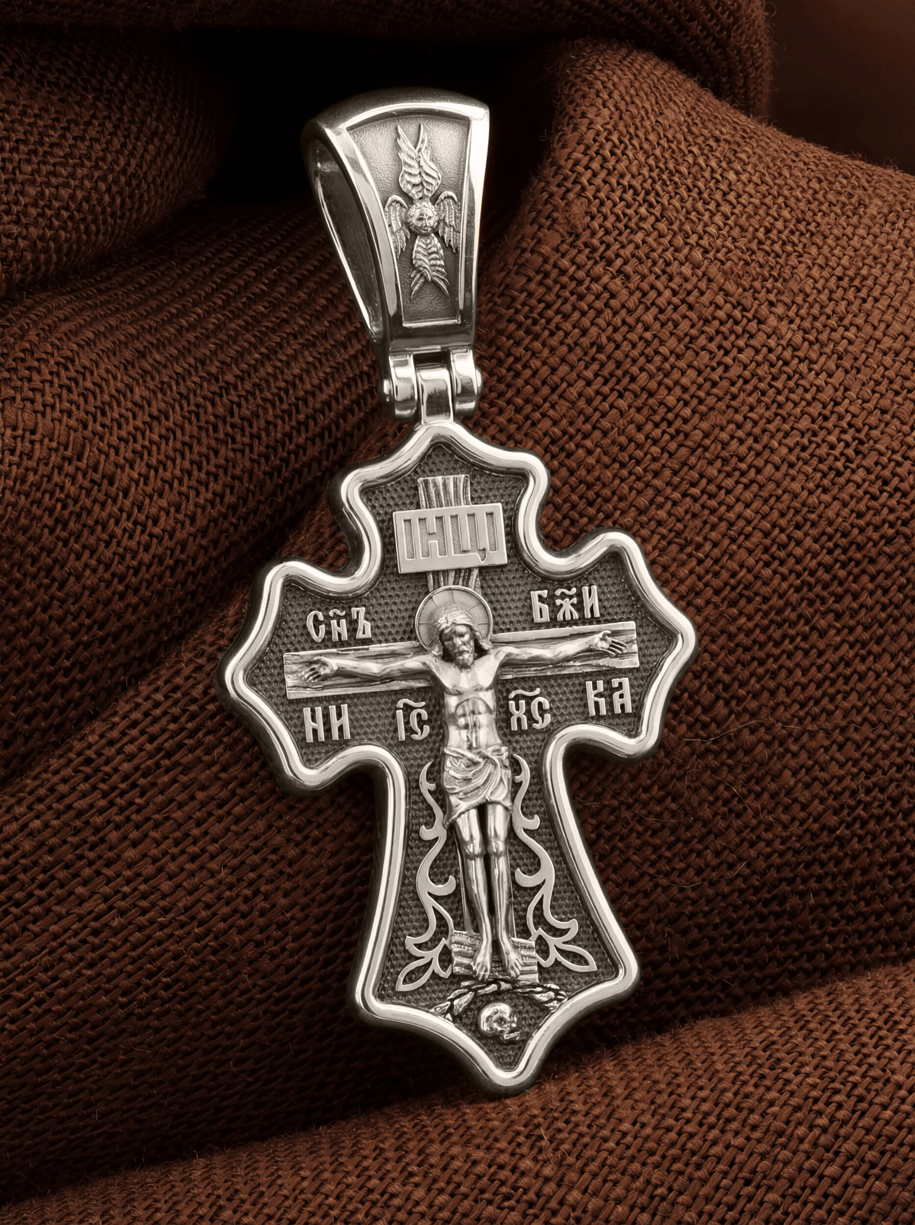 Основной композицией лицевой стороны является Распятие Господа Иисуса Христа. Позади Распятия видна иерусалимская стена, знак того, что Господь был распят вне стен города. Стена символизирует и Небесный Иерусалим, путь который открылся для человека через Голгофу. У подножья Господа в виде скалистой горки видна сама Голгофа с Главой Адамовой в пещере. Распятие сопровождается каноническими надписями. Это святое имя Христа, которое принято писать на иконах сокращенно — «ИС ХС», словосочетание «СЫН БОЖИЙ», что означает божественную природу Иисуса Христа, и надпись «НИКА» — «победитель». Над головой Господа на поперечной перекладине аббревиатура «IНЦI», что символизирует табличку, которая была прибита к Кресту, с надписью «Иисус Назорей Царь Иудейский».