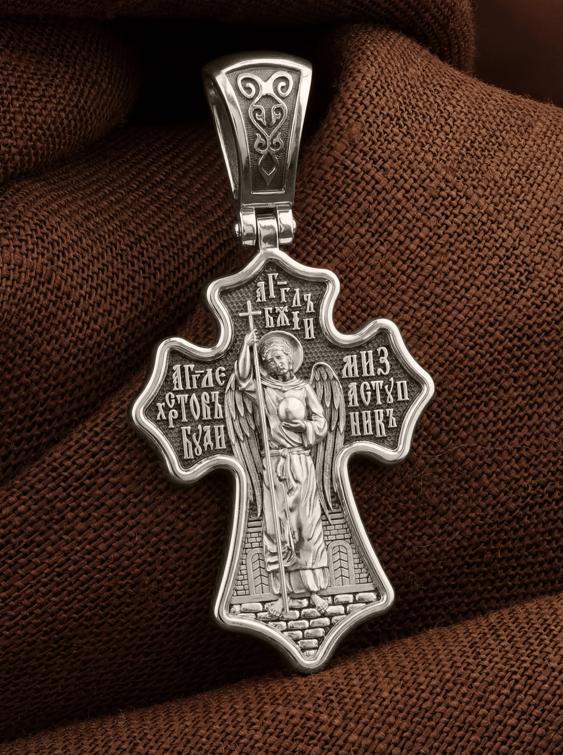 Оборотную сторону креста возглавляет Ангел Хранитель. Он защищает человека от злых духовных и физических нападений. Ангел не может нарушить свободу воли человека, поэтому его надо молитвенно просить о помощи. Вокруг его образа написана молитва: «Ангеле Христов, буди ми заступник».