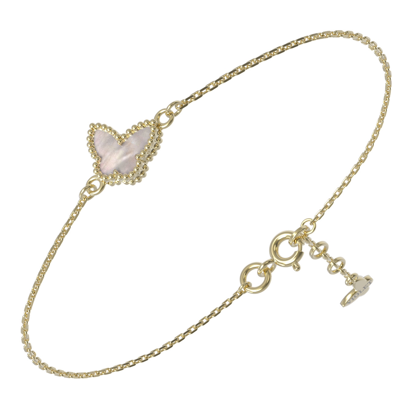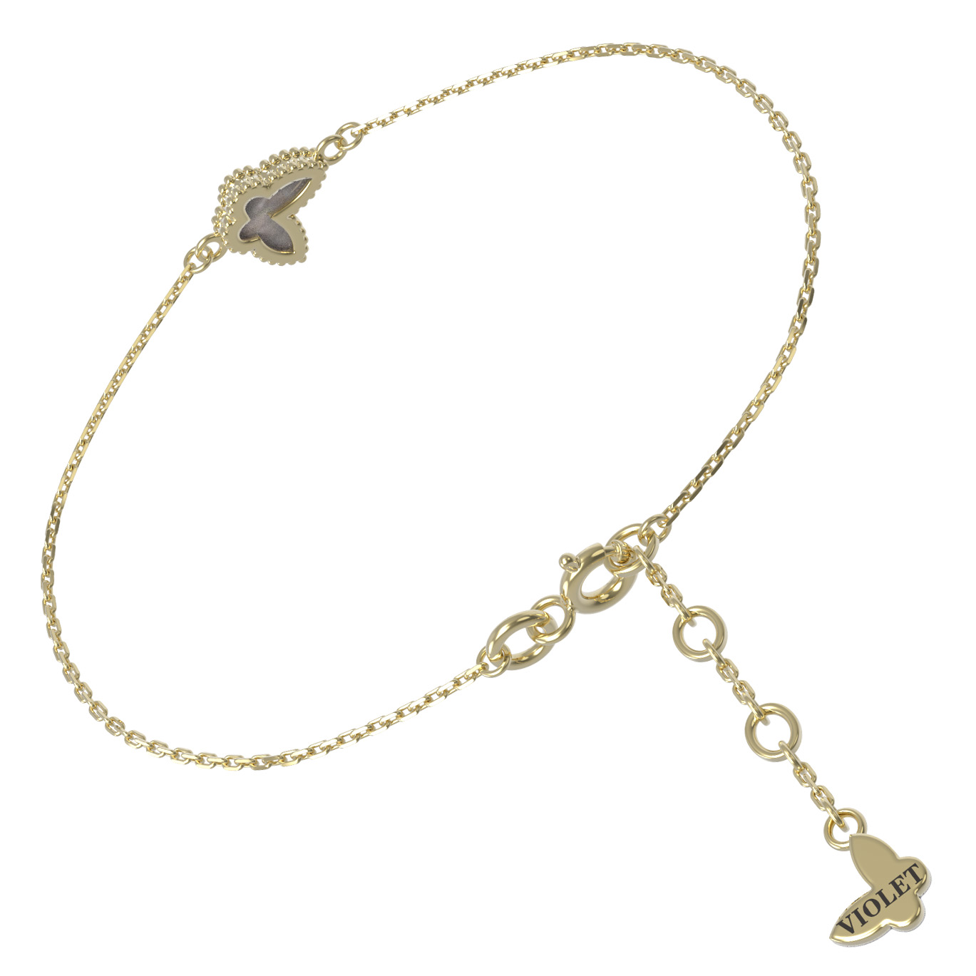 Изящный браслет из лимонного золота 585 пробы из коллекции De Luxe — Бабочки станет утонченным дополнением вашего образа. Дизайн украшения вдохновлен легкостью и грацией природы: центральным элементом изделия является нежная бабочка, инкрустированная натуральным перламутром. Переливы перламутра в сочетании с теплым оттенком лимонного золота создают мягкое сияние, которое подчеркнет ваш безупречный вкус.