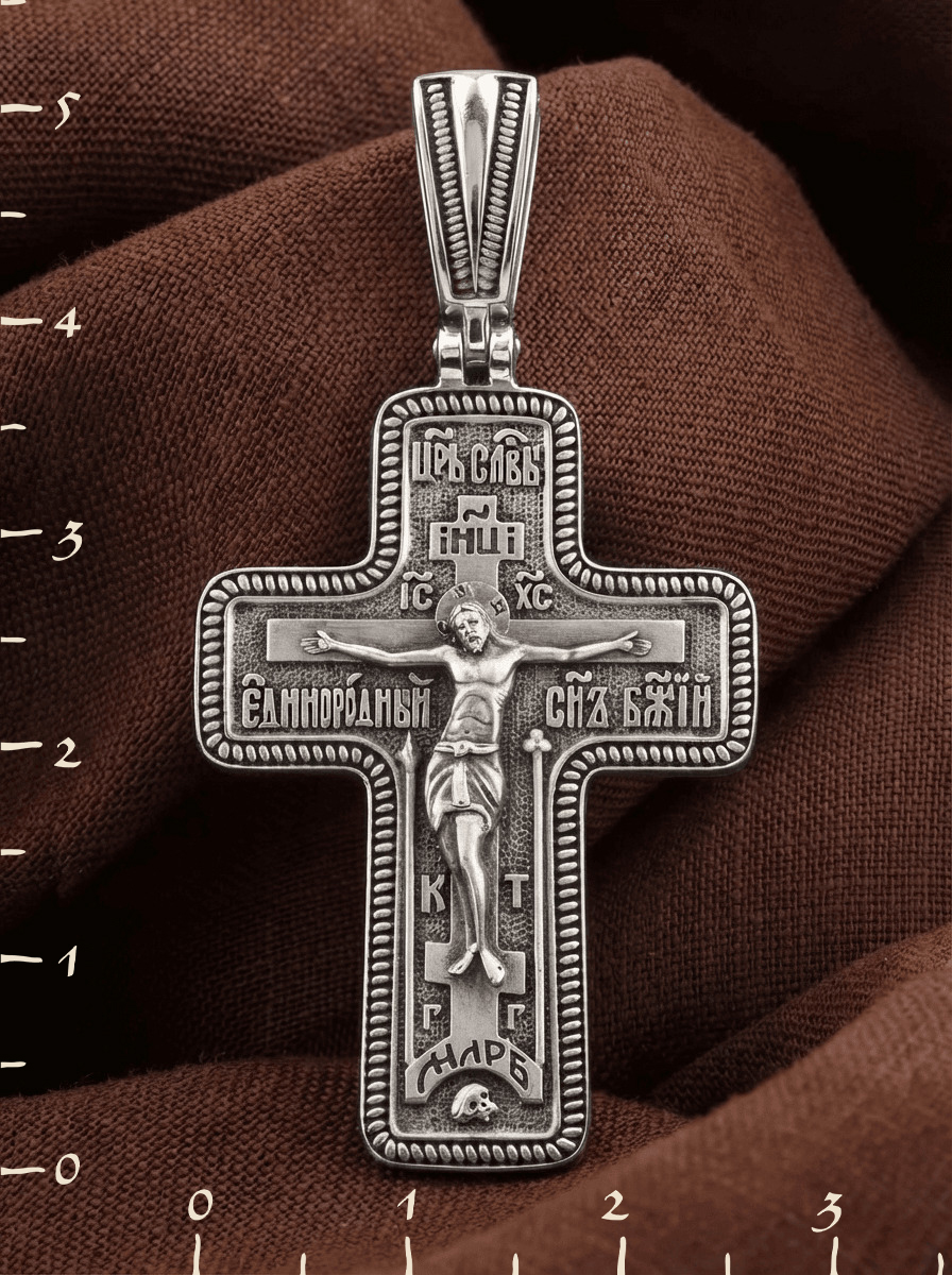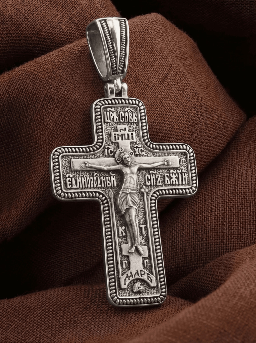 На лицевой стороне креста изображено Распятие, потому что это орудие казни Иисус Христос сделал орудием победы над грехом и смертью. Своими страданиями Он искупил грехи человечества, умерев и сошествовав во ад, победил сатану, освободил души праведников от вечной смерти и открыл им небесные врата рая. Жертва Христа сделала возможным спасение для каждого человека. На православном кресте Христос не умирает, а свободно простирает руки, ладони Иисуса открыты, будто он хочет обнять все человечество, даря им свою любовь и открывая путь к вечной жизни.