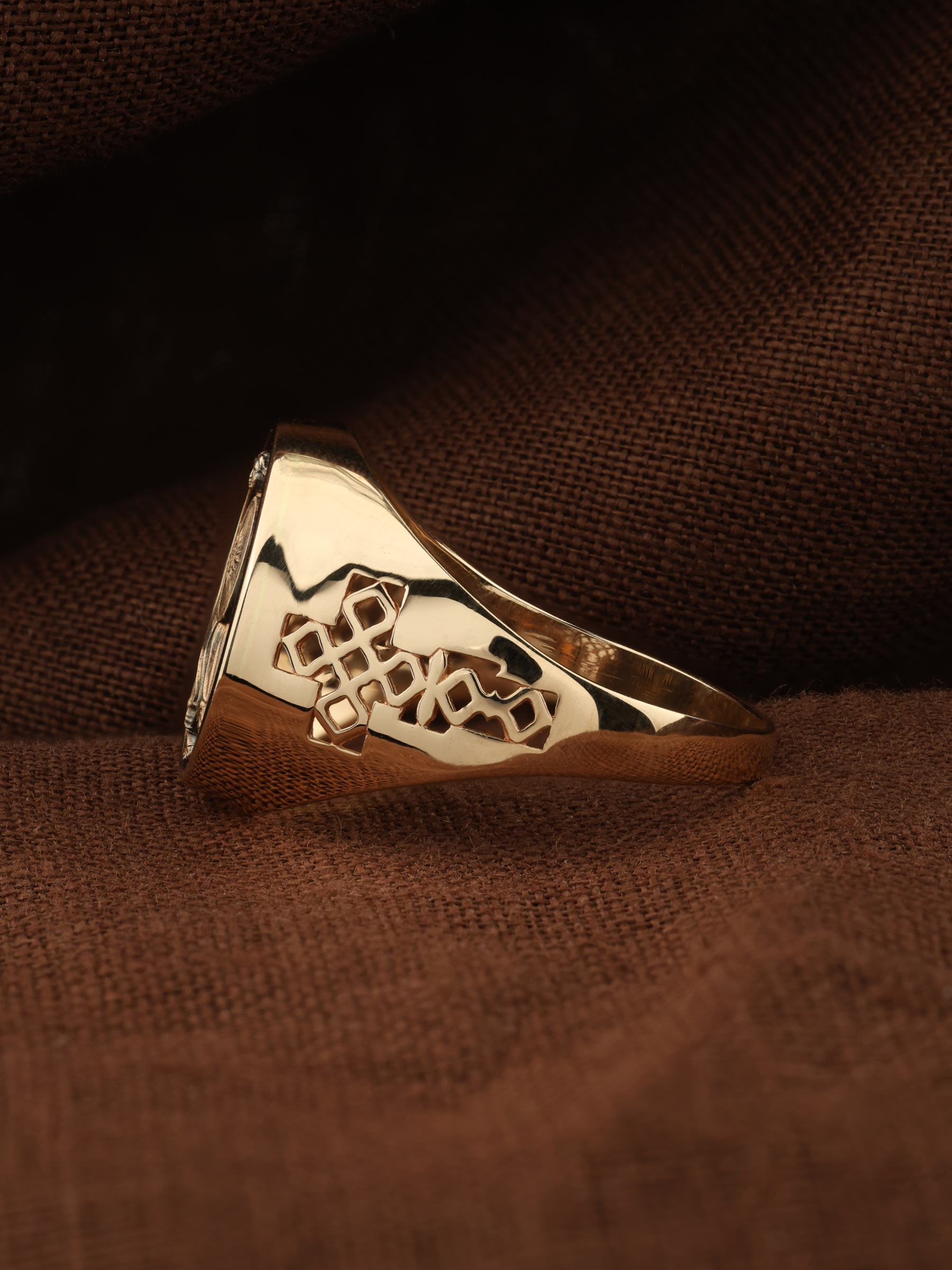 Кольцо «Архангела Михаила» выполнено в древних христианских традициях. В центре помещен образ Архангела Михаила — верного служителя Божия, который низринул с Неба возгордившегося денницу с другими павшими духами. Он изображен в воинственном виде с огненным мечом в правой руке и щитом в левой. В Православии его называют Архистратигом, что означает глава святого воинства Ангелов и Архангелов. Вокруг образа размещена молитва: «Кресту твоему поклоняемся, Христе, честному хранителю мира, спасения нас грешных, велию очистилищу, верным победе».