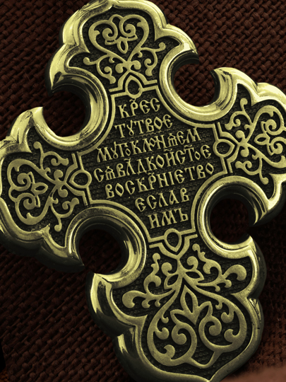 На оборотной стороне креста написана песнь: «Кресту Твоему поклоняемся, Владыко, и святое Воскресение Твое славим». На кулонном кольце изображен Ангел Серафим.