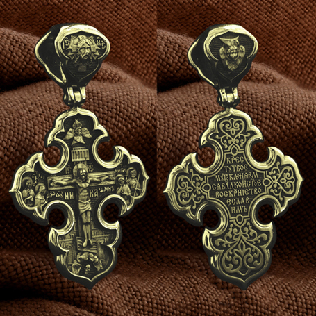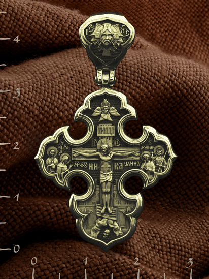 На лицевой стороне креста изображено Распятие Господа и Спасителя нашего Иисуса Христа. Своими крестными страданиями Господь смыл наши грехи, покрыл наш долг перед Богом или, на языке Писания, нас «искупил». В Голгофе сокрыта непостижимая тайна бесконечной правды и любви Бога. Крест стал символом победы добра над злом, жизни над смертью, напоминанием бесконечной Божьей любви, предметом радости. Воплотившийся Сын Божий Своею кровью освятил крест и сделал его проводником Своей благодати, источником освящения верующих. На верхней табличке, выше головы Иисуса, расположена надпись, составленная Понтием Пилатом — «IНЦI». Она означает «Иисус Назорей, Царь Иудейский». Ниже перекладины написано сокращенно имя Спасителя «IC» «XC» — Иисус Христос. Крест стоит на горе камней, символизирующих Голгофу. Под подножием Креста изображена покоящаяся голова (череп) Адама. Слева от Распятия стоят оплакивающие Господа Пресвятая Богородица и святая мироносица Мария Клеопова. Справа — апостол и евангелист Иоанн Богослов, один из ближайших учеников Иисуса Христа и сотник Лонгин с крестом в правой руке и копьем — в левой. По преданию, увидя, что они горько плачут, Иисус сказал Матери Своей: «Жено! Се сын Твой!» Потом сказал ученику Иоанну: «Се мати твоя». С этого времени Иоанн взял Матерь Божию к себе, и Она жила в его доме до самой смерти. На кулонном кольце изображен Спас Нерукотворный — образ Господа и Спасителя нашего Иисуса Христа, чудесно отпечатавшийся на плате, которым Христос вытер свой лик.
