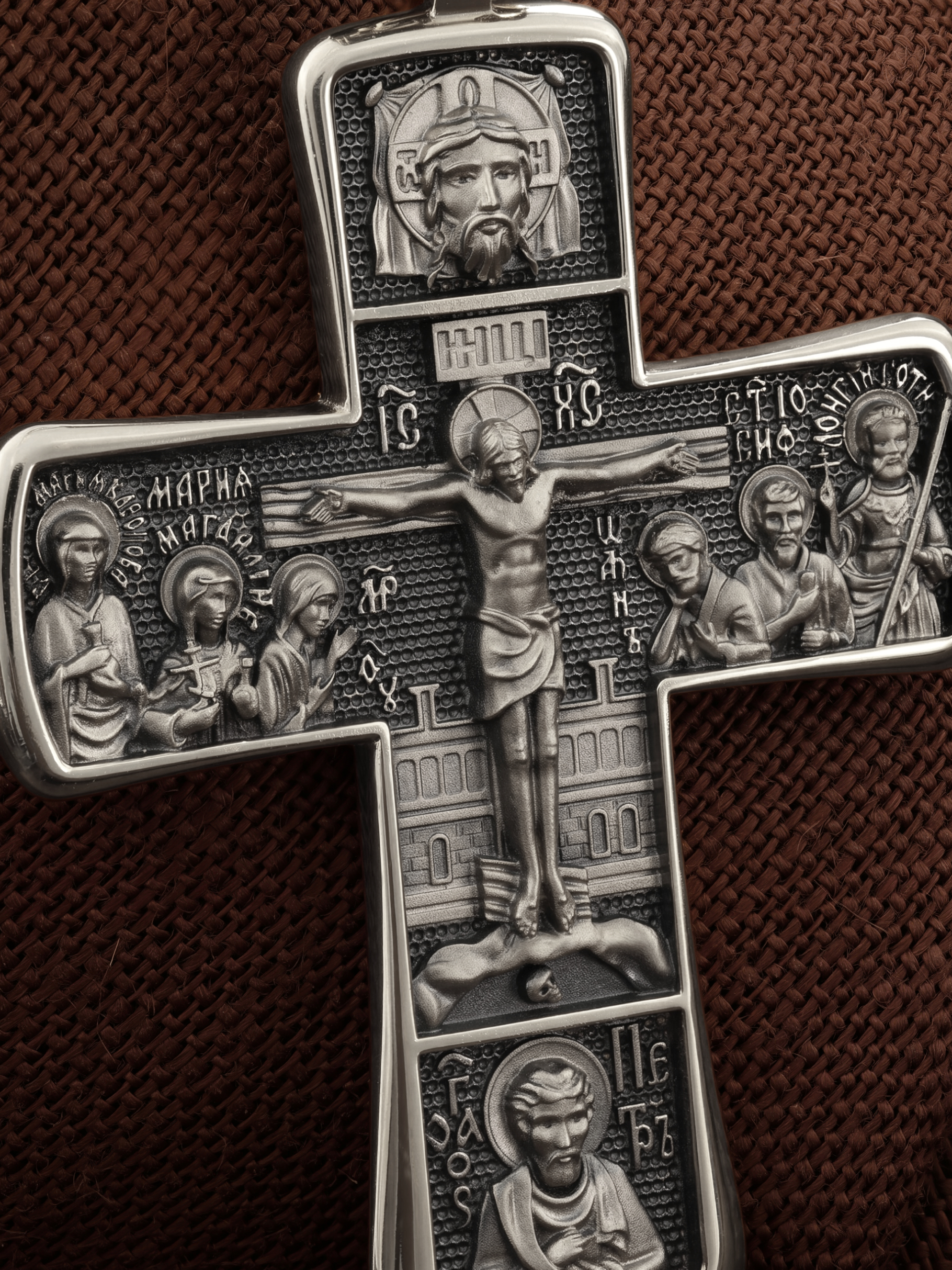 На лицевой стороне креста изображено Распятие Господа Иисуса Христа с предстоящими Ему святыми, которые, по преданию, находились у Креста Господа во время Его казни. Слева — Пресвятая Богородица и жены-мироносицы — равноапостольная Мария Магдалина и святая Мария Клеопова, справа — апостол Иоанн Богослов, прав. Иосиф Аримофейский и мч. Лонгин Сотник.