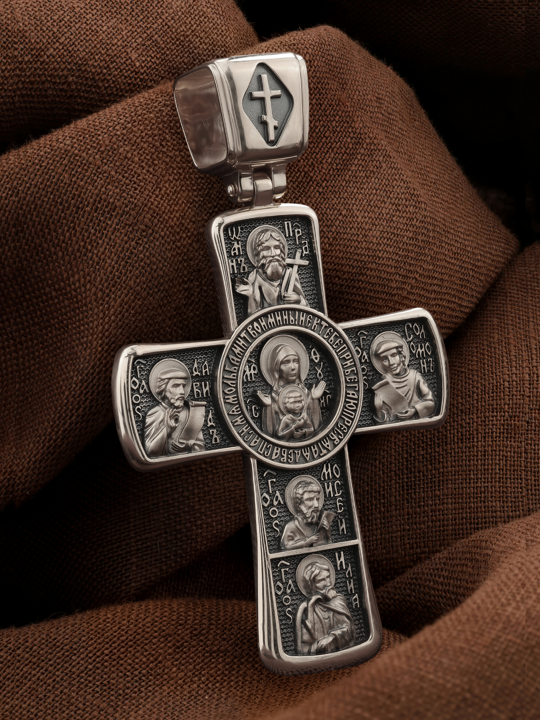Центральную часть оборота креста украшает икона Божией Матери «Знамение». Вокруг Ее образа написана молитва: «Ныне к Тебе прибегаю, Пресвятая Дева, спаси мя мольбами Твоими».
