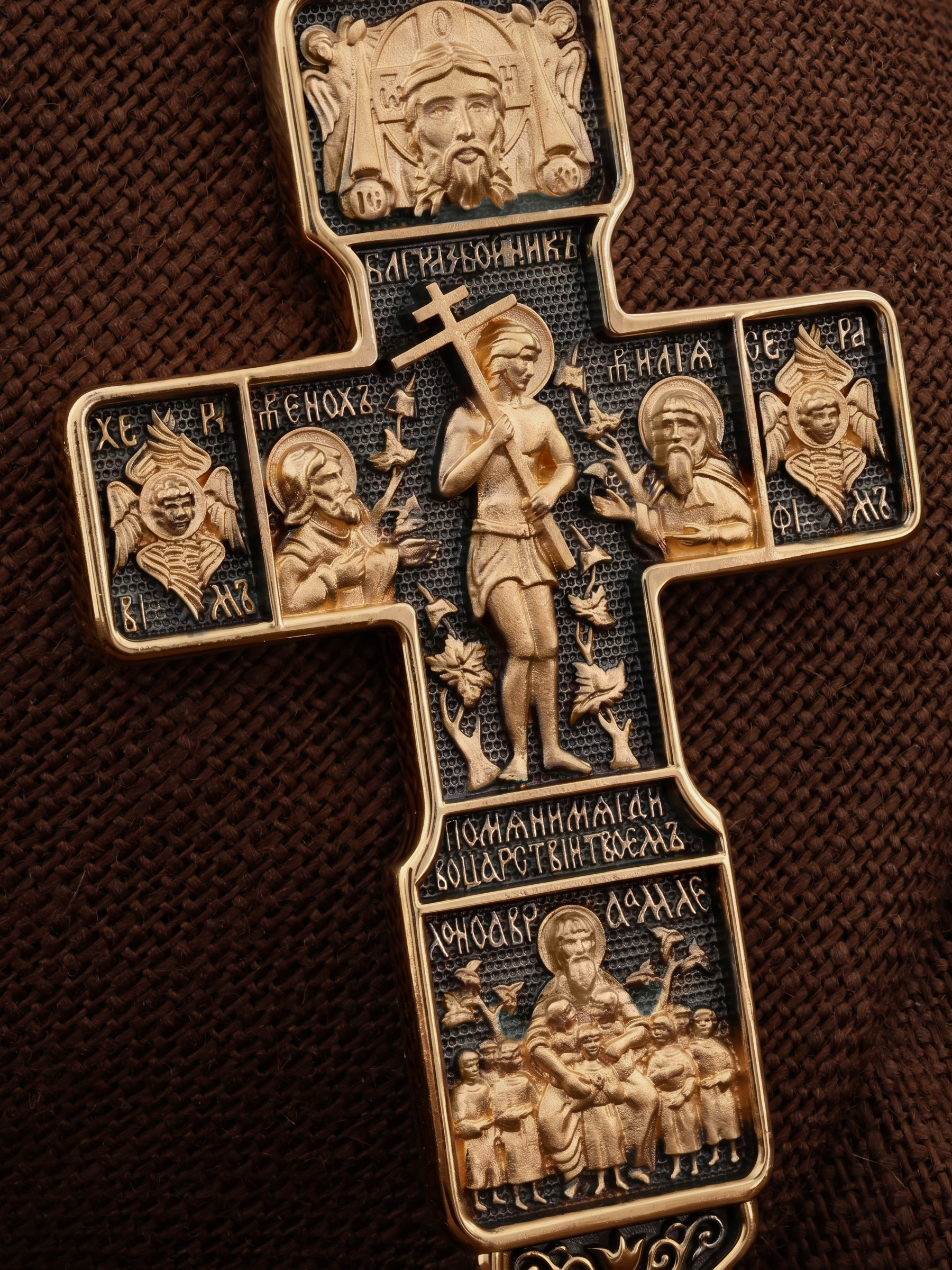 На концах горизонтальной балки креста помещены образы вселенских святителей и творцов литургии Василия Великого и Иоанна Златоуста. В кулонном кольце изображены райские врата с их стражем — Херувимом. Врата, которые открылись благодаря крестной жертве Христа.