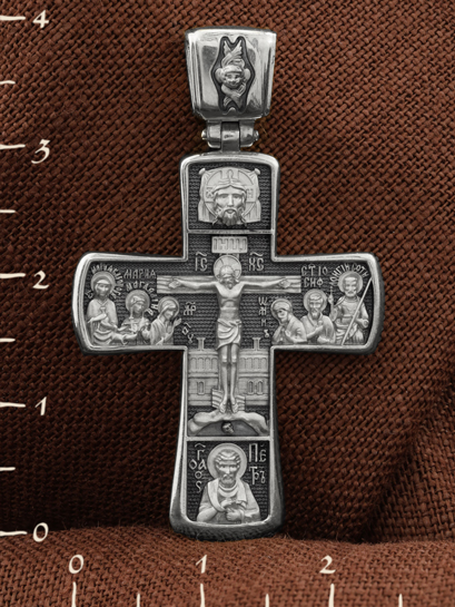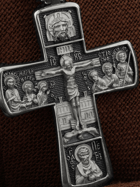 На лицевой стороне креста изображено Распятие Господа Иисуса Христа с предстоящими Ему святыми, которые, по преданию, находились у Креста Господа во время Его казни. Слева — Пресвятая Богородица и жены-мироносицы — равноапостольная Мария Магдалина и святая Мария Клеопова, справа — апостол Иоанн Богослов, прав. Иосиф Аримофейский и мч. Лонгин Сотник.
