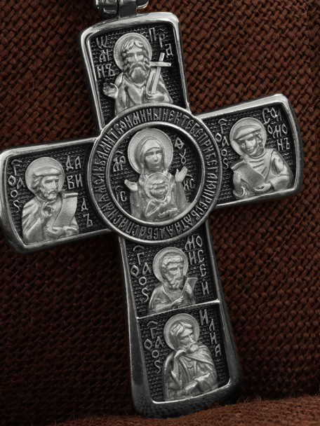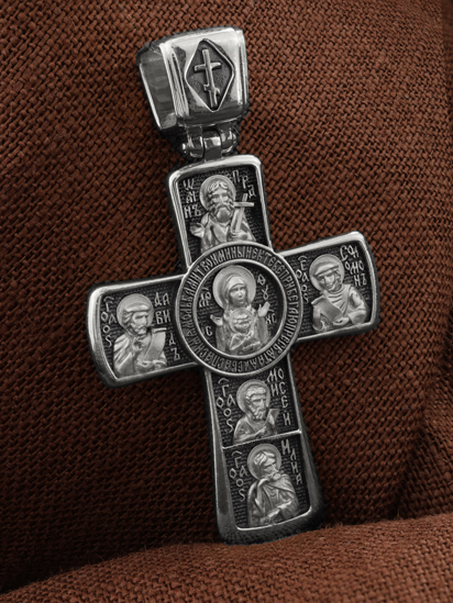 Центральную часть оборота креста украшает икона Божией Матери «Знамение». Вокруг Ее образа написана молитва: «Ныне к Тебе прибегаю, Пресвятая Дева, спаси мя мольбами Твоими».
