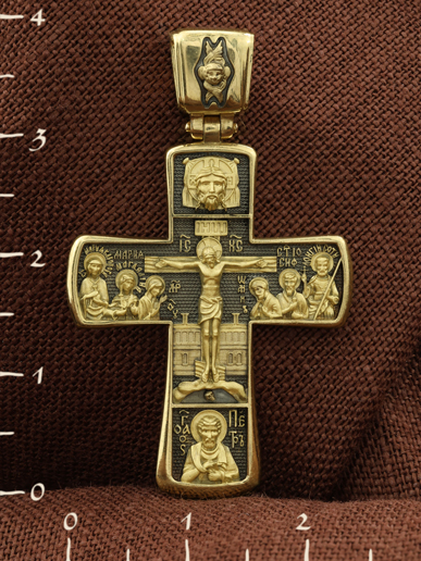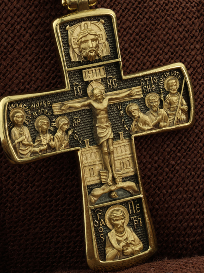 На лицевой стороне креста изображено Распятие Господа Иисуса Христа с предстоящими Ему святыми, которые, по преданию, находились у Креста Господа во время Его казни. Слева — Пресвятая Богородица и жены-мироносицы — равноапостольная Мария Магдалина и святая Мария Клеопова, справа — апостол Иоанн Богослов, прав. Иосиф Аримофейский и мч. Лонгин Сотник.