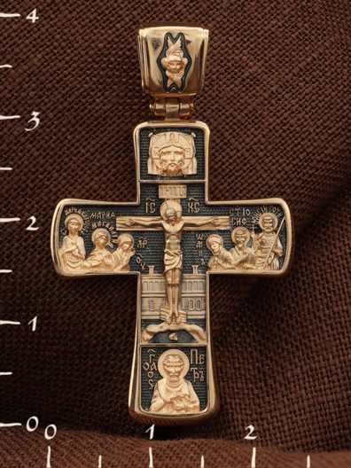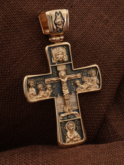 На лицевой стороне креста изображено Распятие Господа Иисуса Христа с предстоящими Ему святыми, которые, по преданию, находились у Креста Господа во время Его казни. Слева — Пресвятая Богородица и жены-мироносицы — равноапостольная Мария Магдалина и святая Мария Клеопова, справа — апостол Иоанн Богослов, прав. Иосиф Аримофейский и мч. Лонгин Сотник.