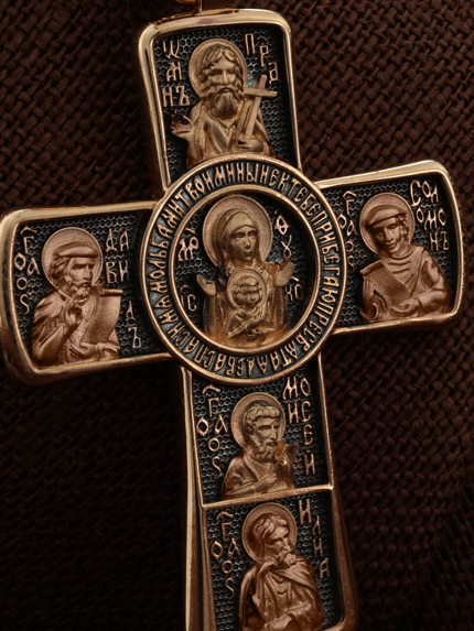 Центральную часть оборота креста украшает икона Божией Матери «Знамение». Вокруг Ее образа написана молитва: «Ныне к Тебе прибегаю, Пресвятая Дева, спаси мя мольбами Твоими».
