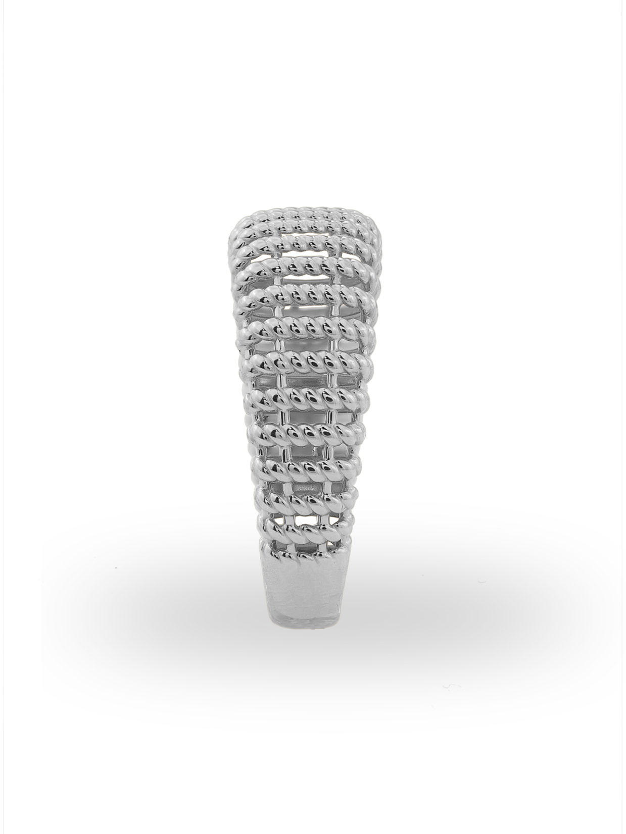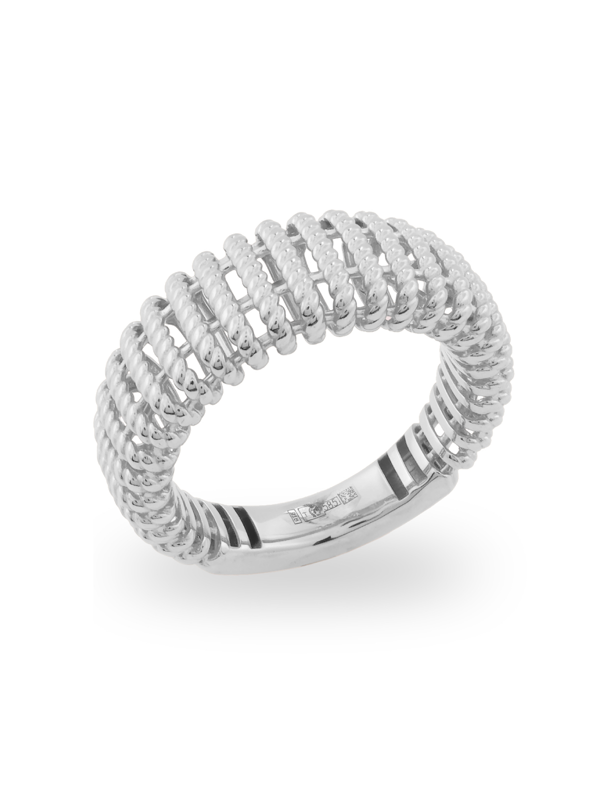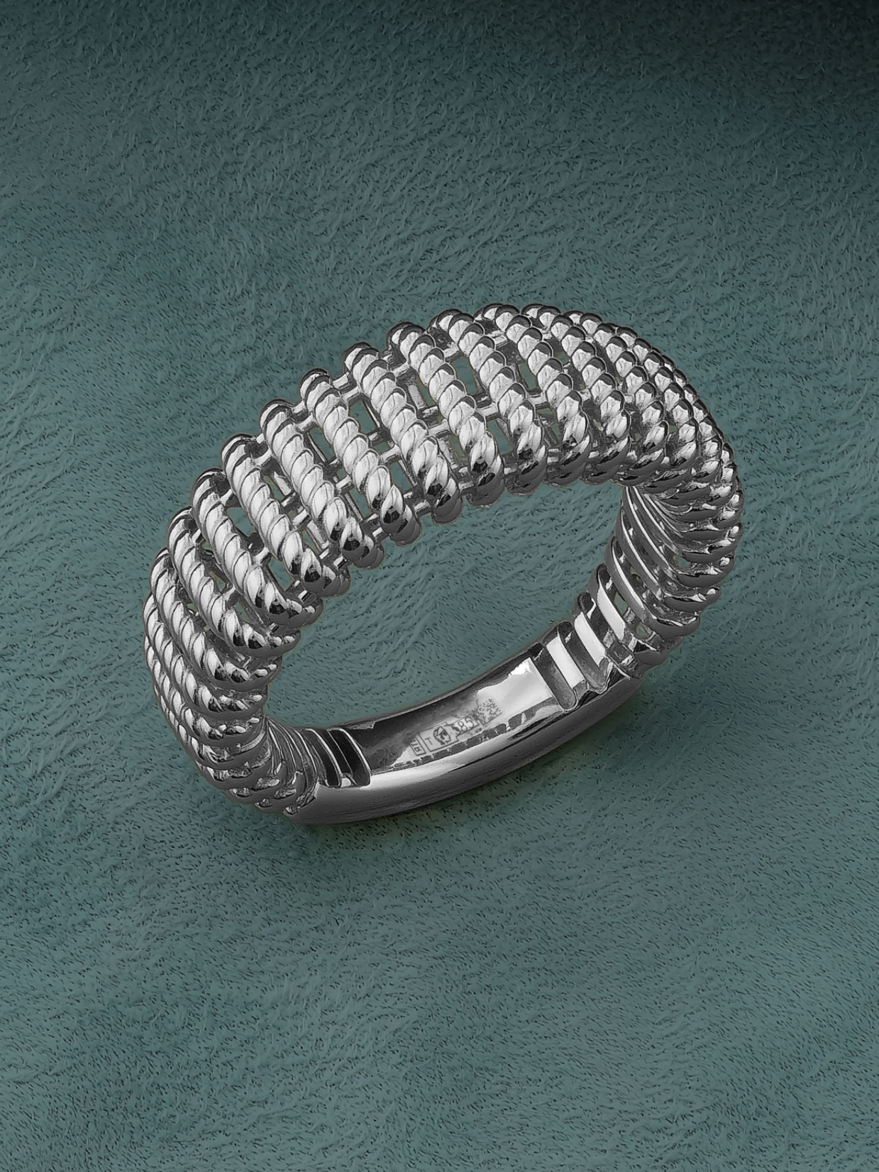 Представляем вашему вниманию стильное кольцо из белого золота, воплощающее современную эстетику и безупречный вкус. Данное украшение из коллекции Vioretty — Cavo привлекает внимание своим необычным дизайном: верхняя часть изделия выполнена в виде объемной фактурной шинки, напоминающей переплетение витых элементов, что создает эффектный акцент на руке. Лаконичный блеск металла подчеркивает глубину формы и придает аксессуару выразительность.