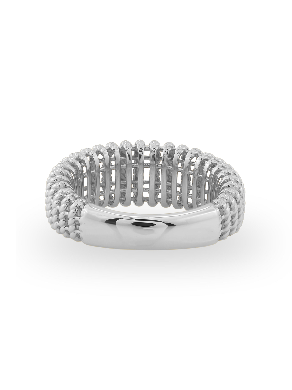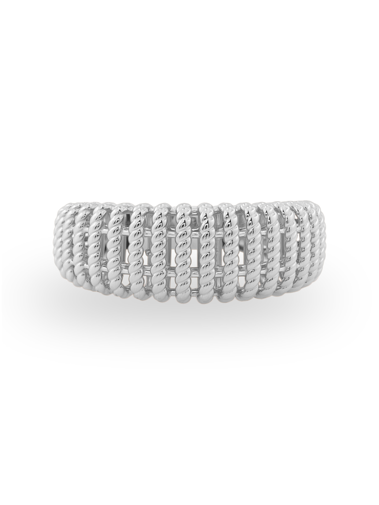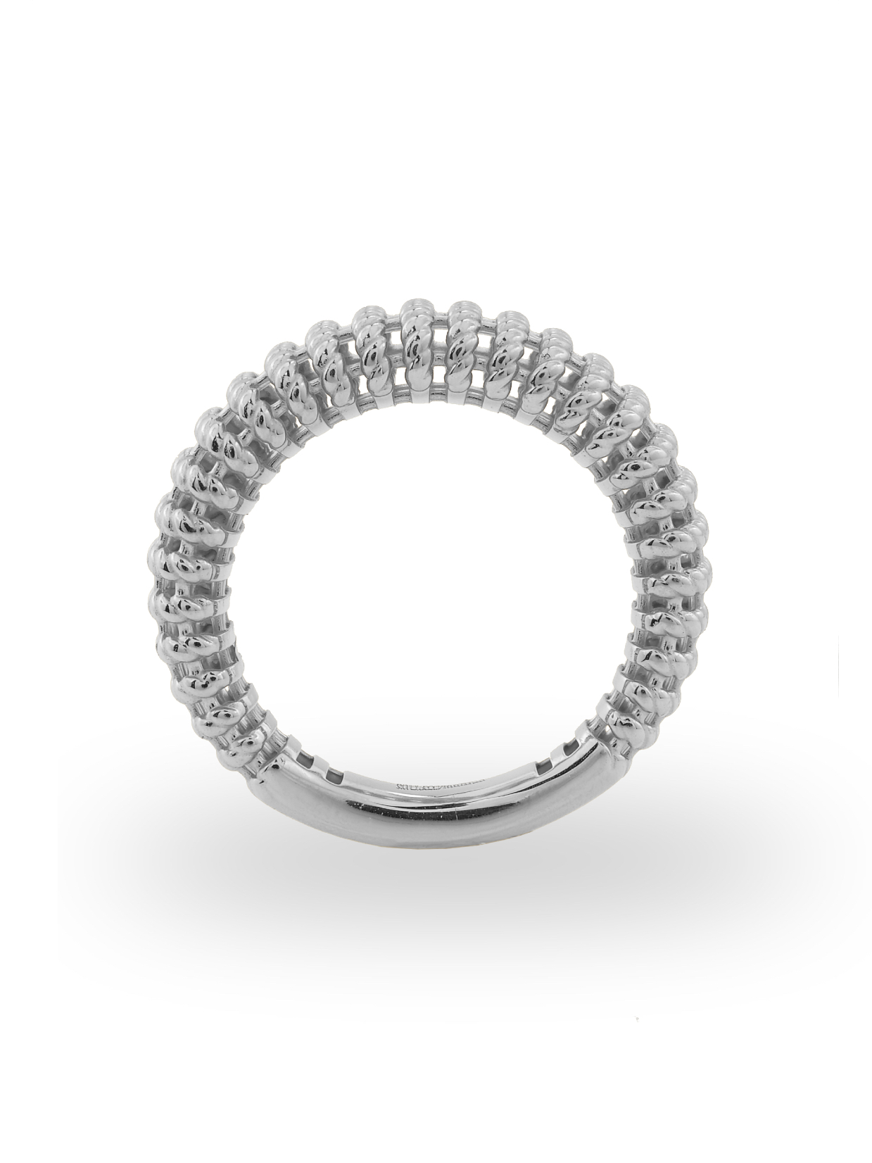 Представляем вашему вниманию стильное кольцо из белого золота, воплощающее современную эстетику и безупречный вкус. Данное украшение из коллекции Vioretty — Cavo привлекает внимание своим необычным дизайном: верхняя часть изделия выполнена в виде объемной фактурной шинки, напоминающей переплетение витых элементов, что создает эффектный акцент на руке. Лаконичный блеск металла подчеркивает глубину формы и придает аксессуару выразительность.