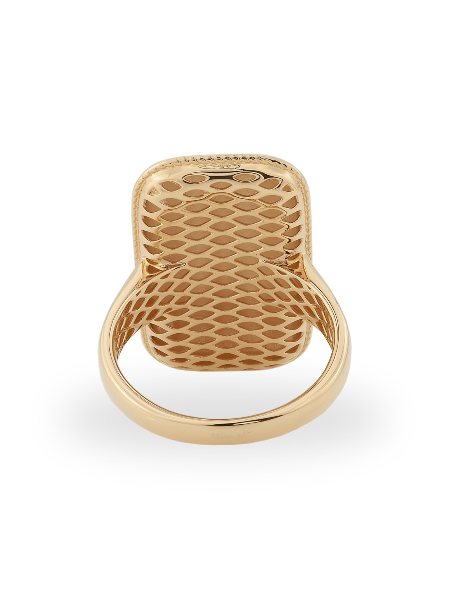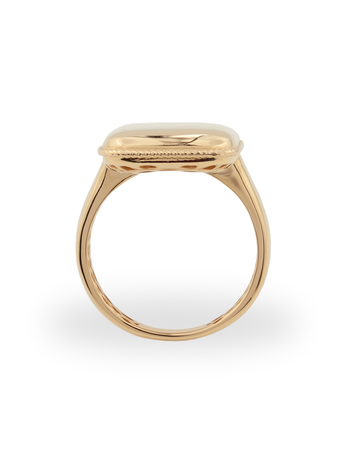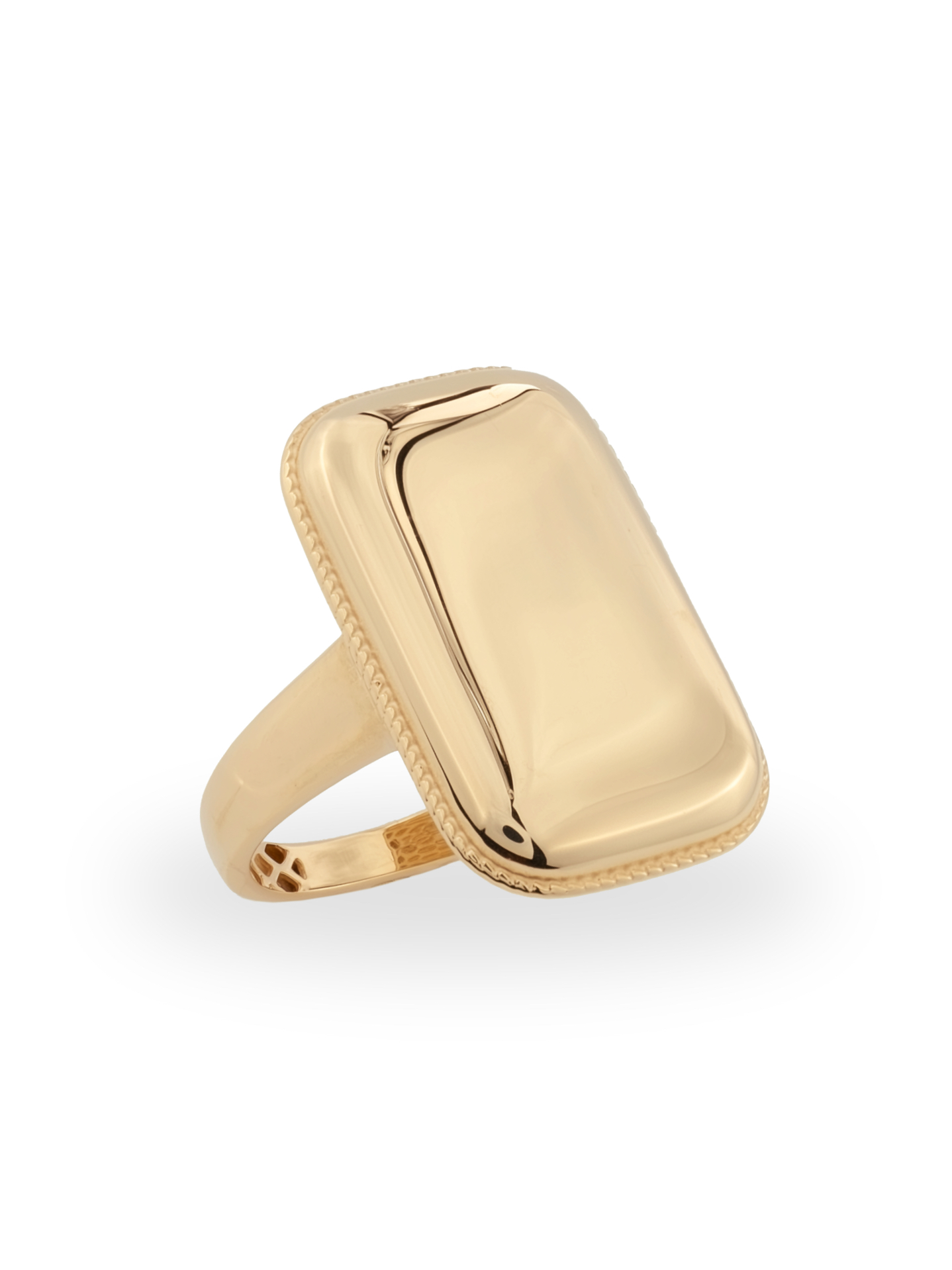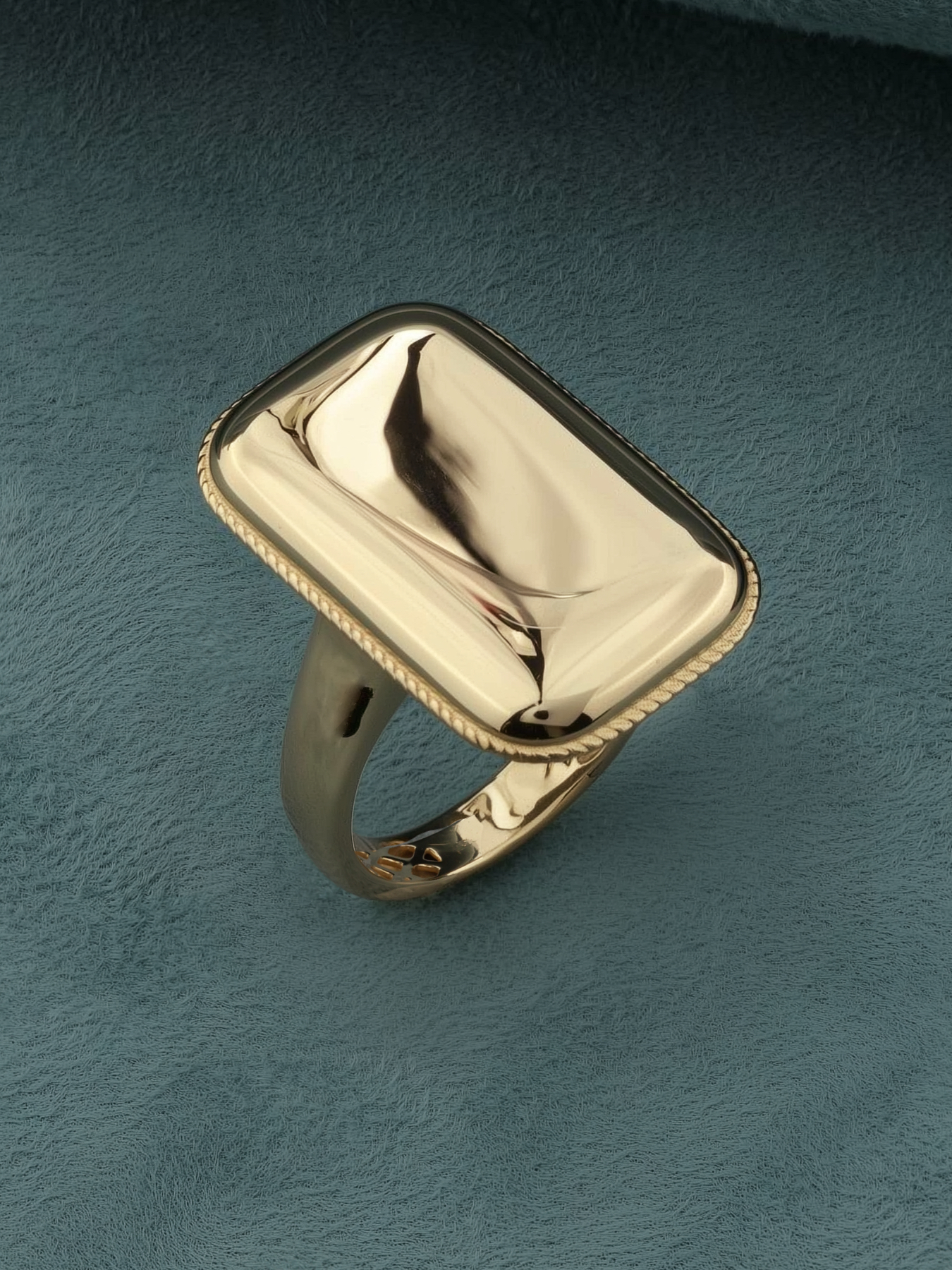 Элегантное кольцо из красного золота 585 пробы станет выразительным акцентом вашего образа. Дизайн украшения, вдохновленный эстетикой геометрии, воплощен в лаконичной, но притягательной форме. Крупная центральная часть изделия выполнена в виде прямоугольника с мягкими контурами, чья зеркальная поверхность эффектно играет на свету. Тонкая филигранная обработка по периметру добавляет изделию фактурности и глубины, подчеркивая мастерство исполнения.
