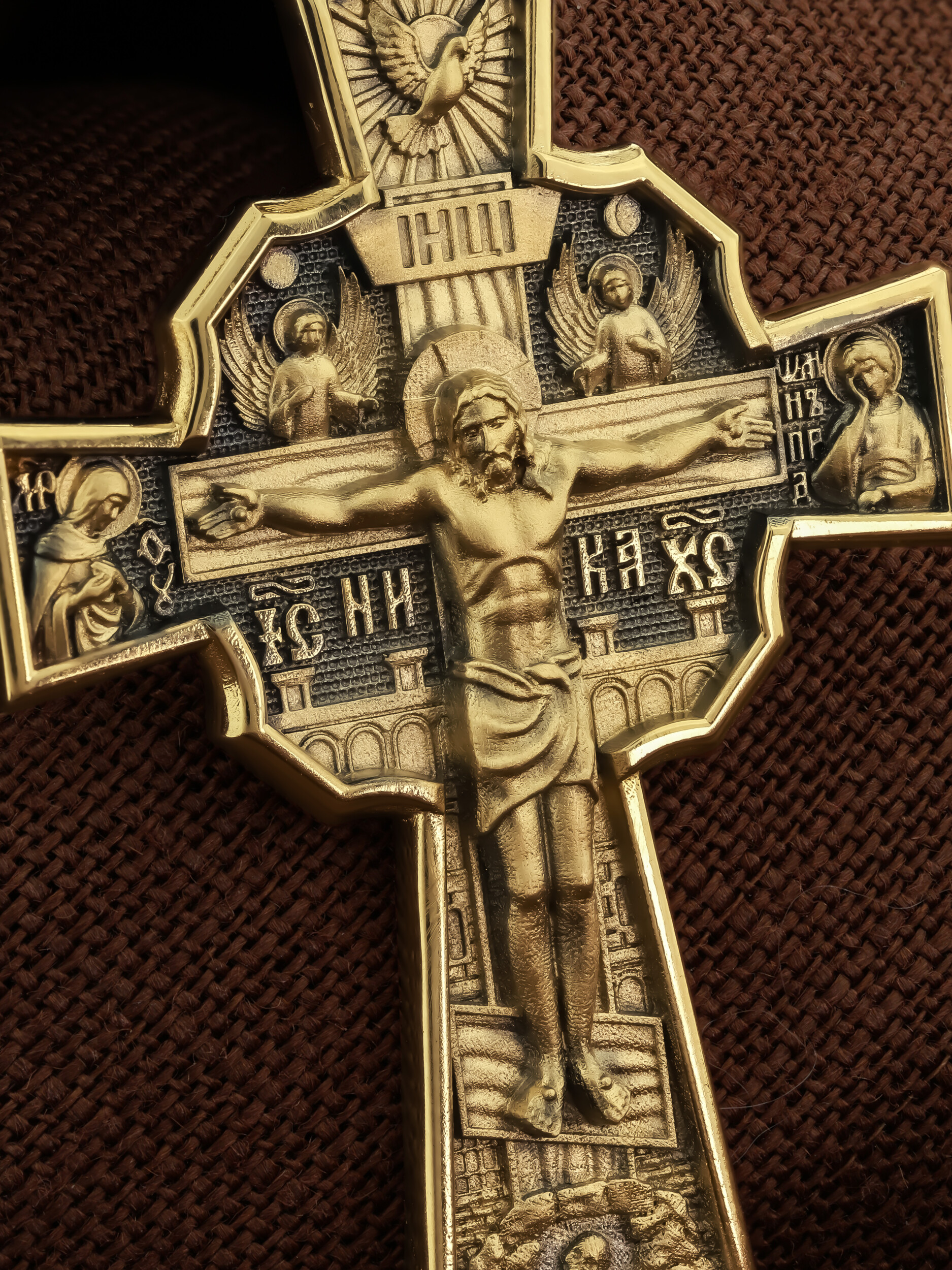 На лицевой стороне креста изображено Распятие Господа и Спасителя нашего Иисуса Христа, отдавшего Себя на смерть, для искупления грехов мира. Верхняя перекладина символизирует титло — табличку, на которой, согласно Евангелию, было начертано: Иисус Назорей Царь Иудейский (IНЦI). Распятие сопровождается надписями, олицетворяющими Христа. Надпись «IС» « ХС», что означает Иисус Христос, и слово «НИКА», что означает «победитель», помещаются ниже поперечной перекладины креста. Над вершиной Распятия помещено изображение Святого Духа, в виде голубя сходящего с небес, и двух Ангелов. Слева от Распятия изображена Пресвятая Богородица, справа — апостол и евангелист Иоанн Богослов, один из ближайших учеников Иисуса Христа. За крестом высится Иерусалимская стена, в знак того, что Господь был распят вне стен города. Возвышение, на котором стоит Крест, символизирует гору Голгофу, на которой произошло Распятие. Под подножием Креста изображена покоящаяся голова (череп) Адама. На кулонном кольце помещено изображение шестикрылого Серафим.
