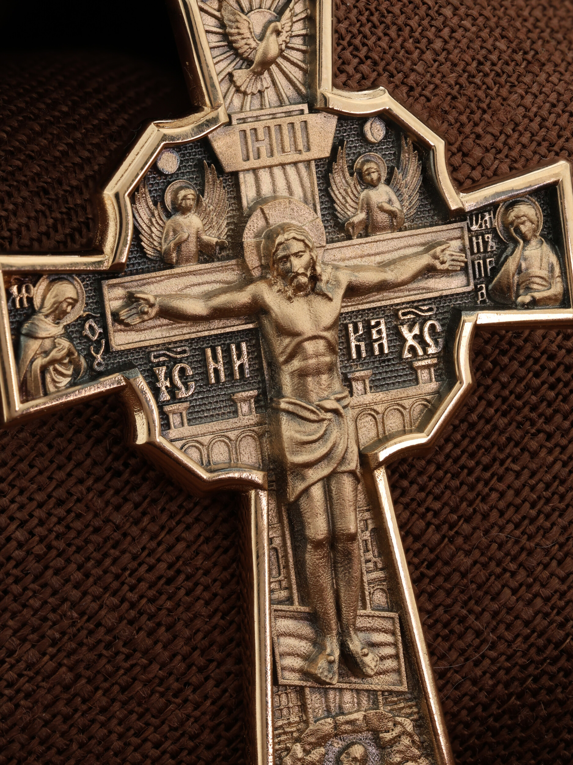 На лицевой стороне креста изображено Распятие Господа и Спасителя нашего Иисуса Христа, отдавшего Себя на смерть, для искупления грехов мира. Верхняя перекладина символизирует титло — табличку, на которой, согласно Евангелию, было начертано: Иисус Назорей Царь Иудейский (IНЦI). Распятие сопровождается надписями, олицетворяющими Христа. Надпись «IС» « ХС», что означает Иисус Христос, и слово «НИКА», что означает «победитель», помещаются ниже поперечной перекладины креста. Над вершиной Распятия помещено изображение Святого Духа, в виде голубя сходящего с небес, и двух Ангелов. Слева от Распятия изображена Пресвятая Богородица, справа — апостол и евангелист Иоанн Богослов, один из ближайших учеников Иисуса Христа. За крестом высится Иерусалимская стена, в знак того, что Господь был распят вне стен города. Возвышение, на котором стоит Крест, символизирует гору Голгофу, на которой произошло Распятие. Под подножием Креста изображена покоящаяся голова (череп) Адама. На кулонном кольце помещено изображение шестикрылого Серафим.