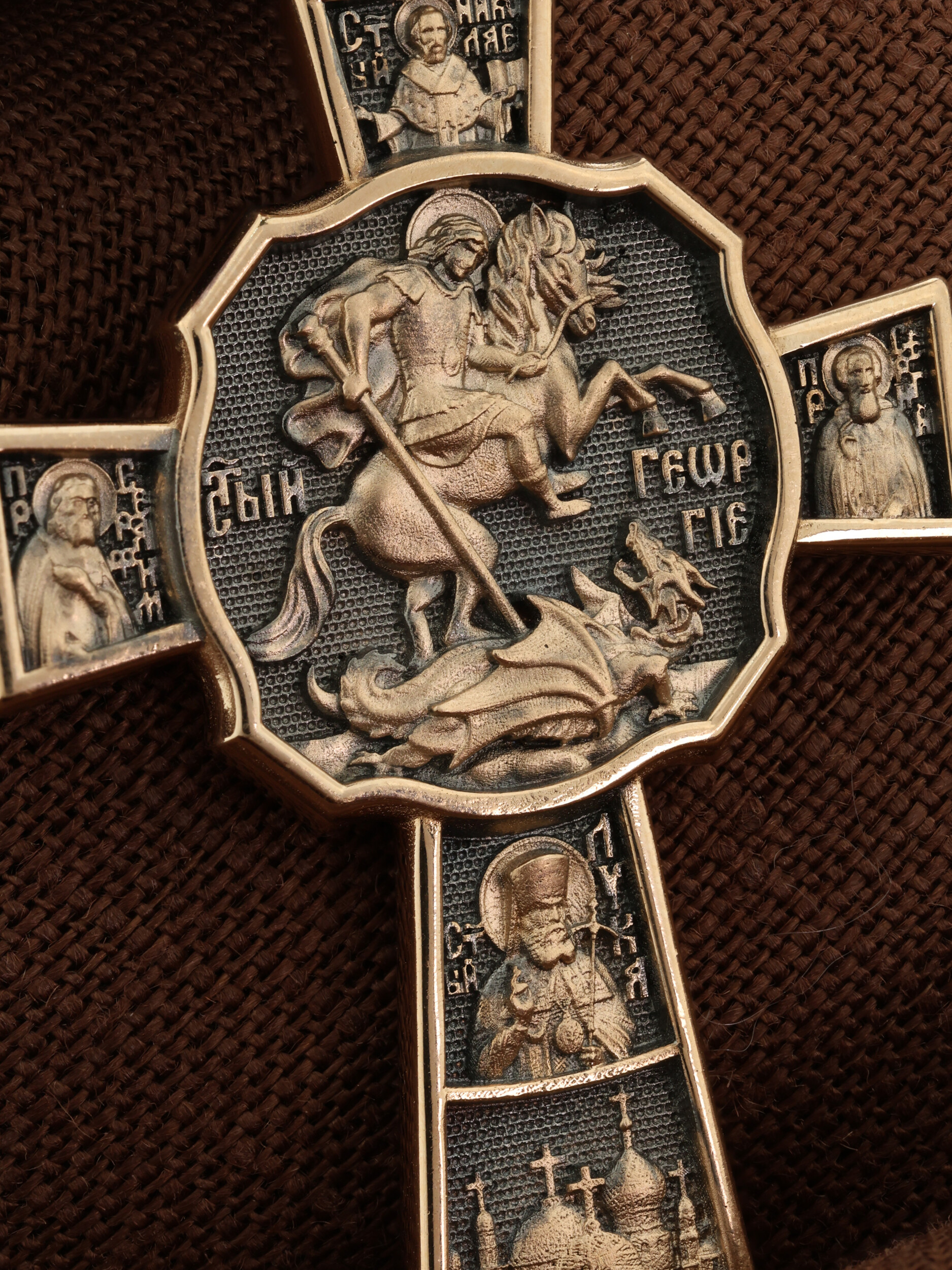 В центре оборотной стороне креста помещен образ Святого Великомученика Георгия Победоносца — одного из самых почитаемых и удивительных святых. На образке он изображен как воитель поражающий копьем огнедышащего змея. Змей символизирует собою сатанинские силы. Справа помещен образ Святого Преподобного Сергия, игумена Радонежского, чудотворца, слева — Преподобного Серафима Саровского, чудотвореца. Выше помещен образ Святителя Николая архиепископа Мир Ликийских, чудотвореца, ниже — образ святителя Луки (Войно-Ясенецкого), архиепископа Симферопольского и Крымского, исповедника и изображение Храма. На кулонном кольце изображен Спас Нерукотворный — образ Господа и Спасителя нашего Иисуса Христа, чудесно отпечатавшийся на плате, котором Христос вытер свой лик.