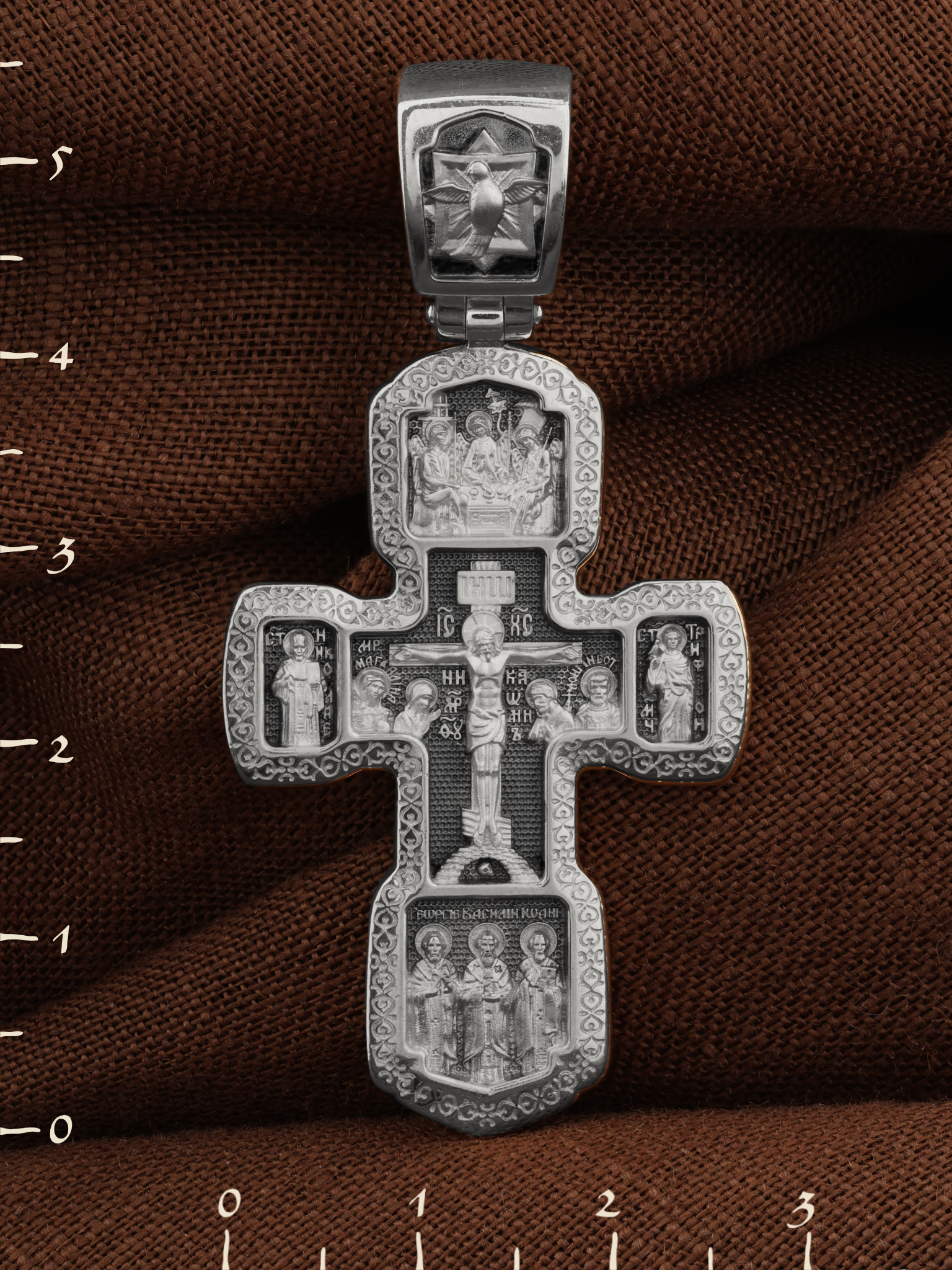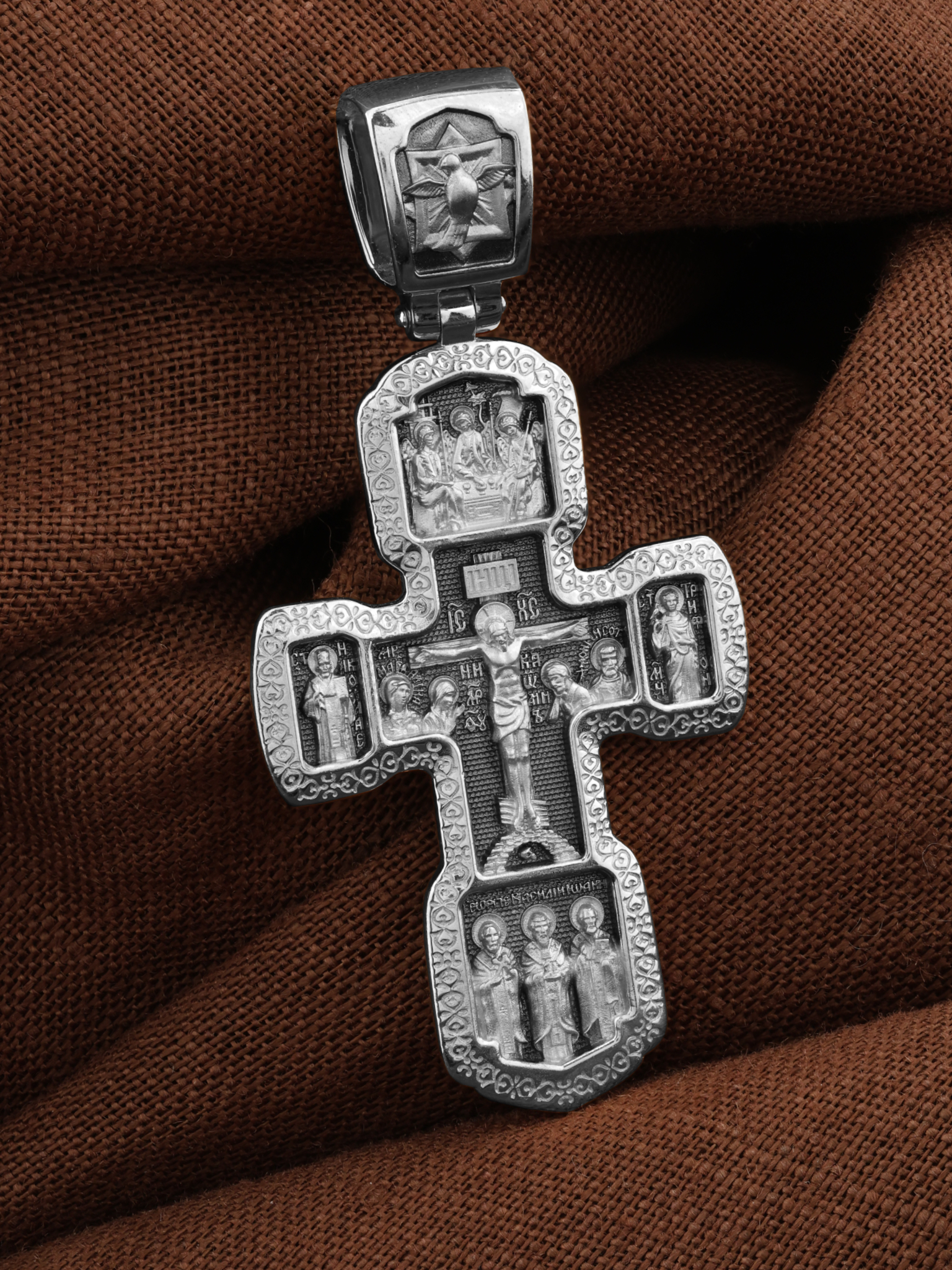 Центральную часть лицевой стороны занимает Распятие Господа Иисуса Христа с предстоящими Ему святыми, которые, по преданию, находились у Креста Господа во время Его казни. Слева — Пресвятая Богородица и жены-мироносицы — равноапостольная Мария Магдалина и святая Мария Клеопова, справа — праведный Иосиф Аримофейский и мученик Лонгин Сотник. Над Распятием помещена икона Святой Троицы. Ангелы сидят за трапезным столом вокруг чаши, которая символизирует грядущую жертву Второго Лица Пресвятой Троицы, Бога Сына. Слева от Господа находится святой Николая Чудотворец, справа — святой мученик.