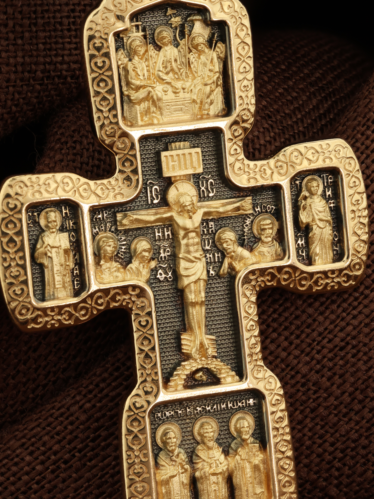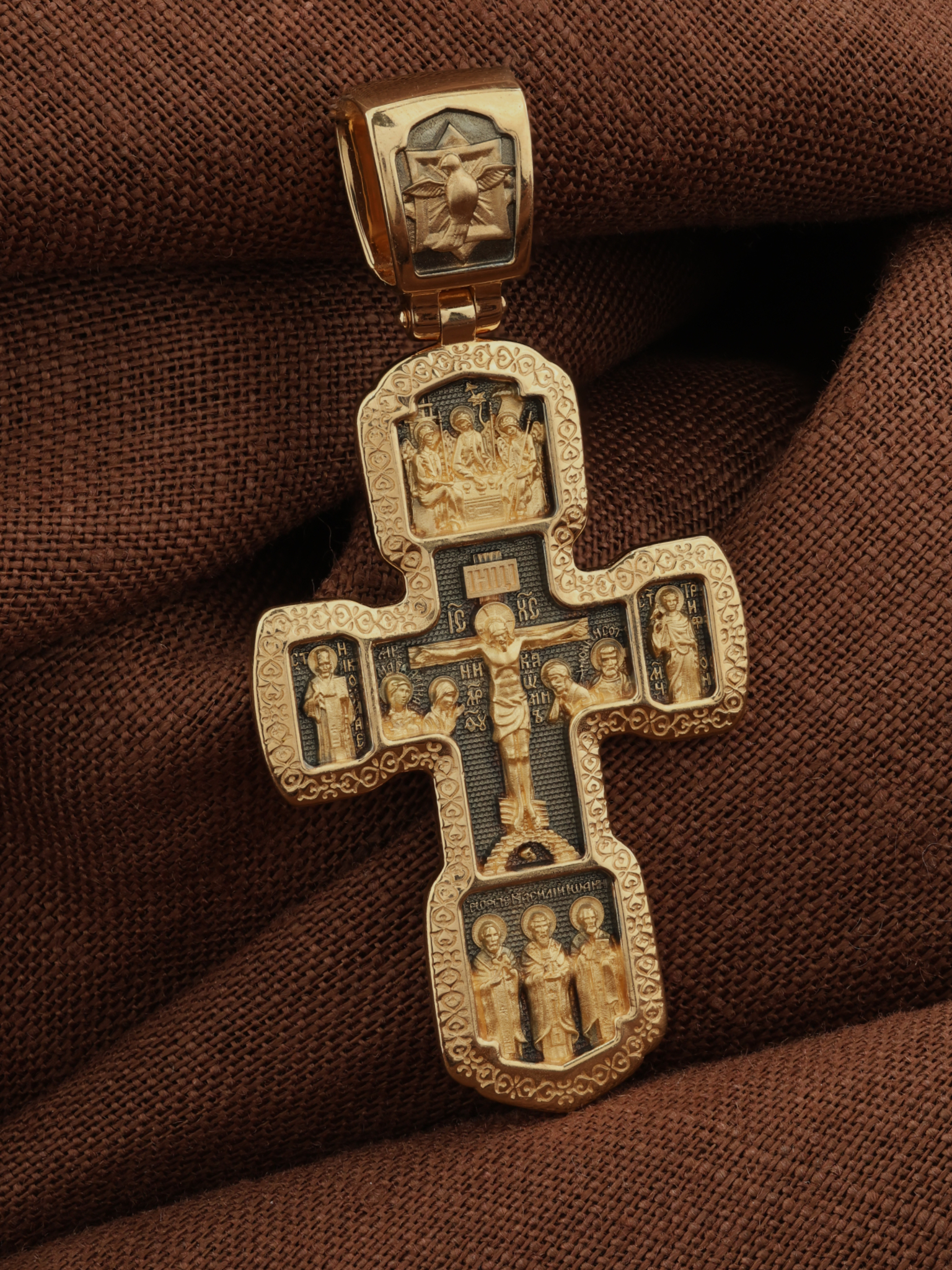 Центральную часть лицевой стороны занимает Распятие Господа Иисуса Христа с предстоящими Ему святыми, которые, по преданию, находились у Креста Господа во время Его казни. Слева — Пресвятая Богородица и жены-мироносицы — равноапостольная Мария Магдалина и святая Мария Клеопова, справа — праведный Иосиф Аримофейский и мученик Лонгин Сотник. Над Распятием помещена икона Святой Троицы. Ангелы сидят за трапезным столом вокруг чаши, которая символизирует грядущую жертву Второго Лица Пресвятой Троицы, Бога Сына. Слева от Господа находится святой Николая Чудотворец, справа — святой мученик.