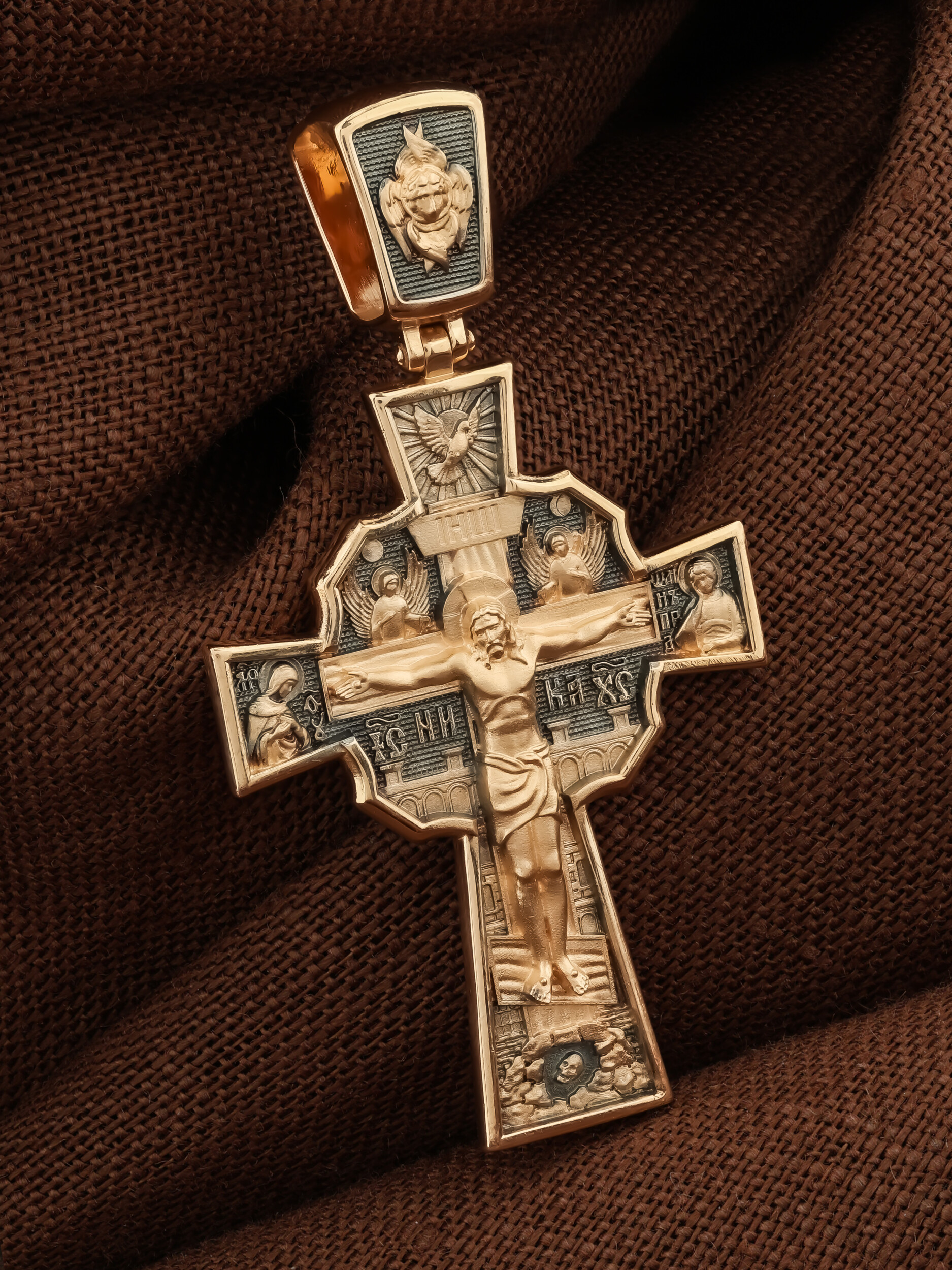 На лицевой стороне креста изображено Распятие Господа и Спасителя нашего Иисуса Христа, отдавшего Себя на смерть, для искупления грехов мира. Верхняя перекладина символизирует титло — табличку, на которой, согласно Евангелию, было начертано: Иисус Назорей Царь Иудейский (IНЦI). Распятие сопровождается надписями, олицетворяющими Христа. Надпись «IС» « ХС», что означает Иисус Христос, и слово «НИКА», что означает «победитель», помещаются ниже поперечной перекладины креста. Над вершиной Распятия помещено изображение Святого Духа, в виде голубя сходящего с небес, и двух Ангелов. Слева от Распятия изображена Пресвятая Богородица, справа — апостол и евангелист Иоанн Богослов, один из ближайших учеников Иисуса Христа. За крестом высится Иерусалимская стена, в знак того, что Господь был распят вне стен города. Возвышение, на котором стоит Крест, символизирует гору Голгофу, на которой произошло Распятие. Под подножием Креста изображена покоящаяся голова (череп) Адама. На кулонном кольце помещено изображение шестикрылого Серафим.