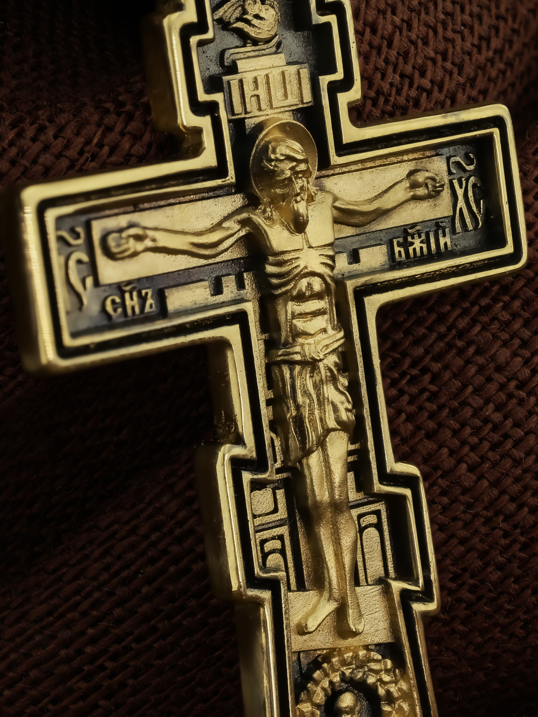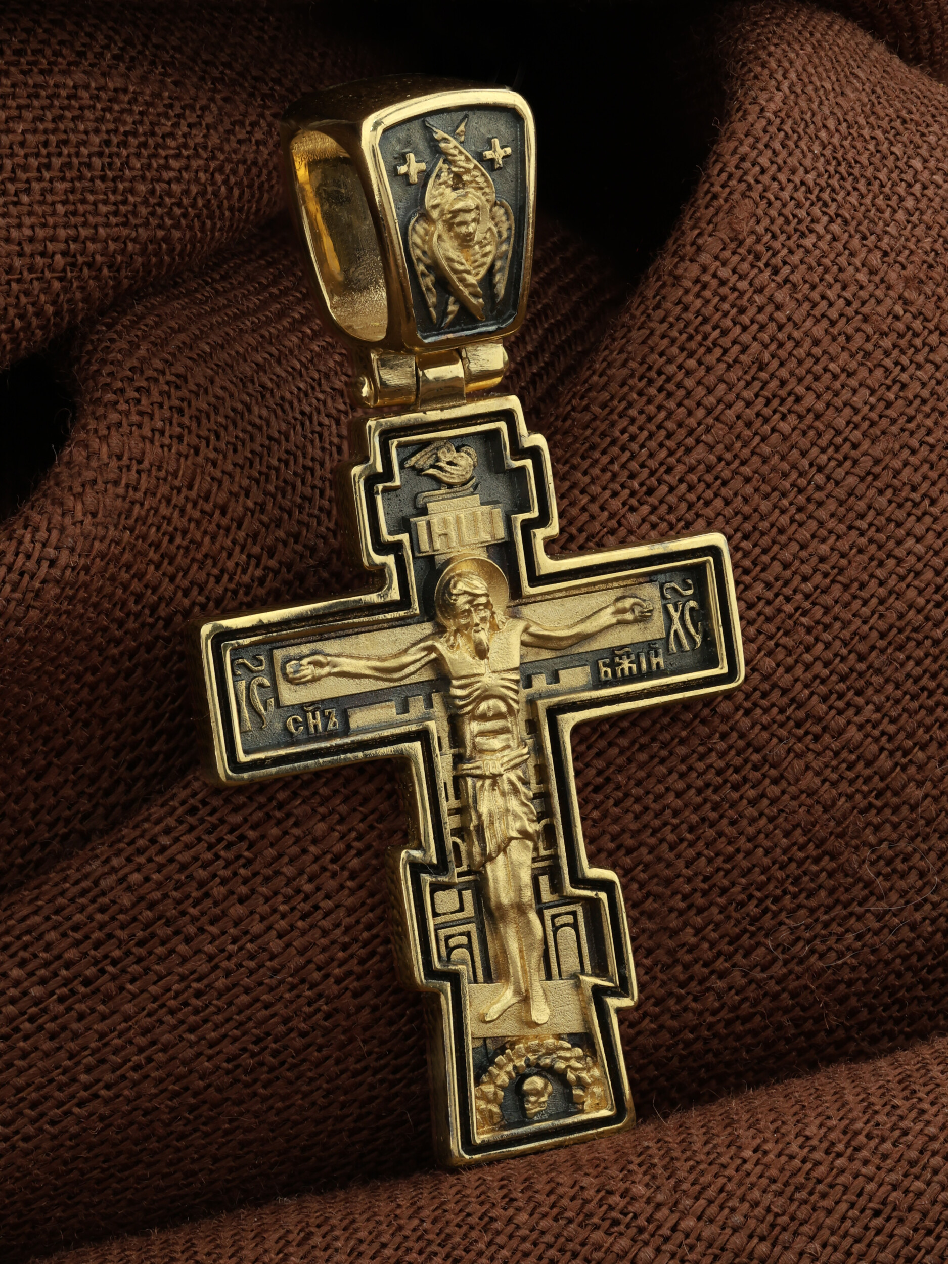 Восьмиконечный нательный крест с Распятием Иисуса Христа на горе Голгофе. Форма этого кресты является одной из самых распространенных на Руси и более всего соответствует тому Кресту, на котором был распят Христос.