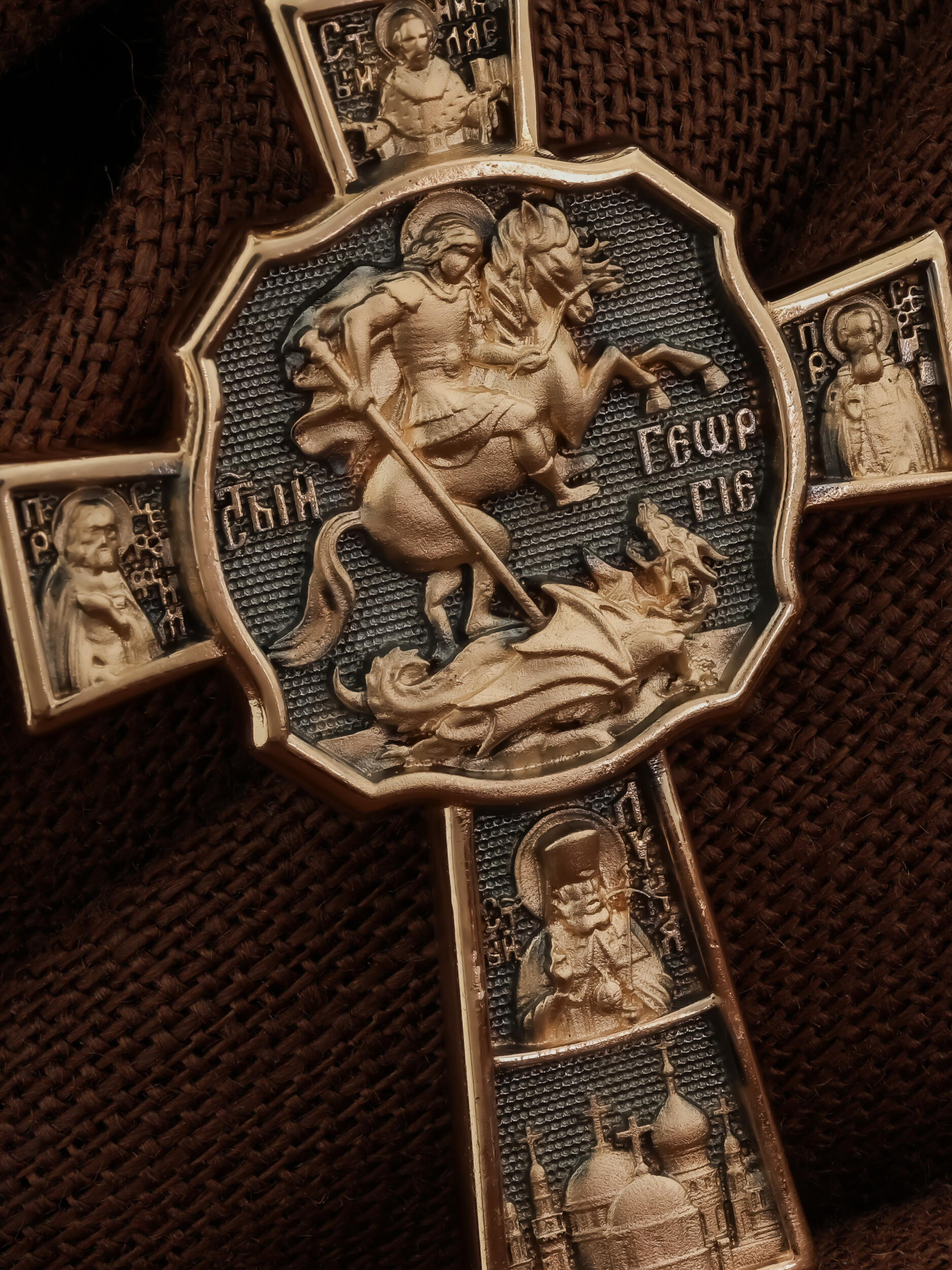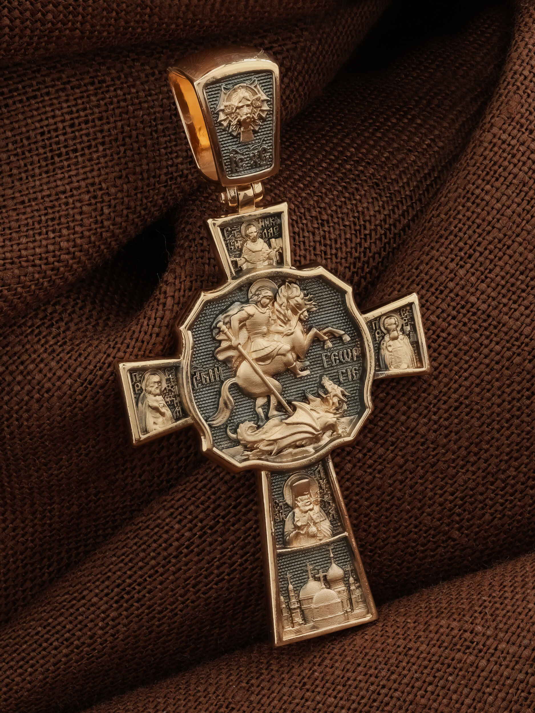 В центре оборотной стороне креста помещен образ Святого Великомученика Георгия Победоносца — одного из самых почитаемых и удивительных святых. На образке он изображен как воитель поражающий копьем огнедышащего змея. Змей символизирует собою сатанинские силы. Справа помещен образ Святого Преподобного Сергия, игумена Радонежского, чудотворца, слева — Преподобного Серафима Саровского, чудотвореца. Выше помещен образ Святителя Николая архиепископа Мир Ликийских, чудотвореца, ниже — образ святителя Луки (Войно-Ясенецкого), архиепископа Симферопольского и Крымского, исповедника и изображение Храма. На кулонном кольце изображен Спас Нерукотворный — образ Господа и Спасителя нашего Иисуса Христа, чудесно отпечатавшийся на плате, котором Христос вытер свой лик.