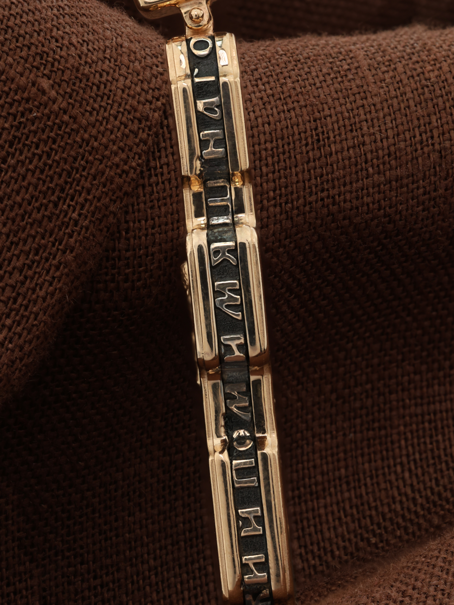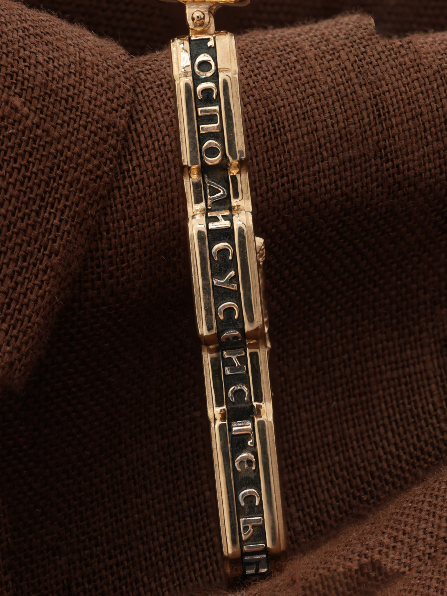 На торцевой стороне креста размещены слова Иисусовой молитвы: «Господи Иисусе Христе, Сыне Божий, помилуй мя, грешного».