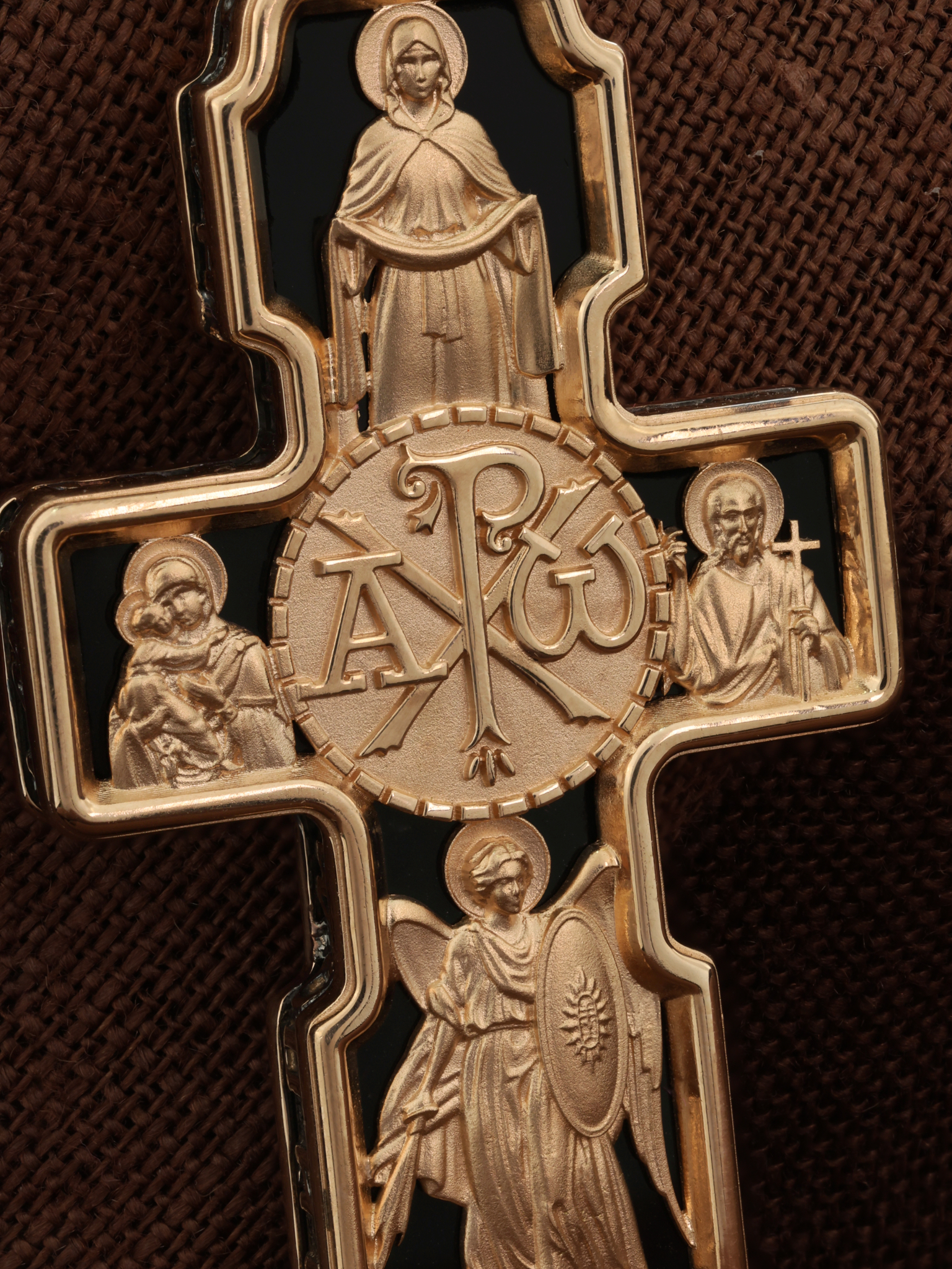 На центральной части оборотной стороны креста размещена Хризма — монограмма имени Христа, которая состоит из двух начальных греческих букв имени — Х (хи) и Р (ро), скрещённых между собой. По краям монограммы находятся греческие буквы, иллюстрирующими отрывок из Апокалипсиса: «Я есть Альфа и Омега, начало и конец…» и обозначающими Божественную безначальность и безконечность. Над Хризмой изображена икона Божией Матери «Покров Пресвятой Богородицы», ниже — образ Архангела Михаила с огненным мечом в правой руке и щитом в левой руке. Слева — образ Владимирской иконы Божией Матери. Справа изображен Пророк Предтеча и Креститель Господень Иоанн.