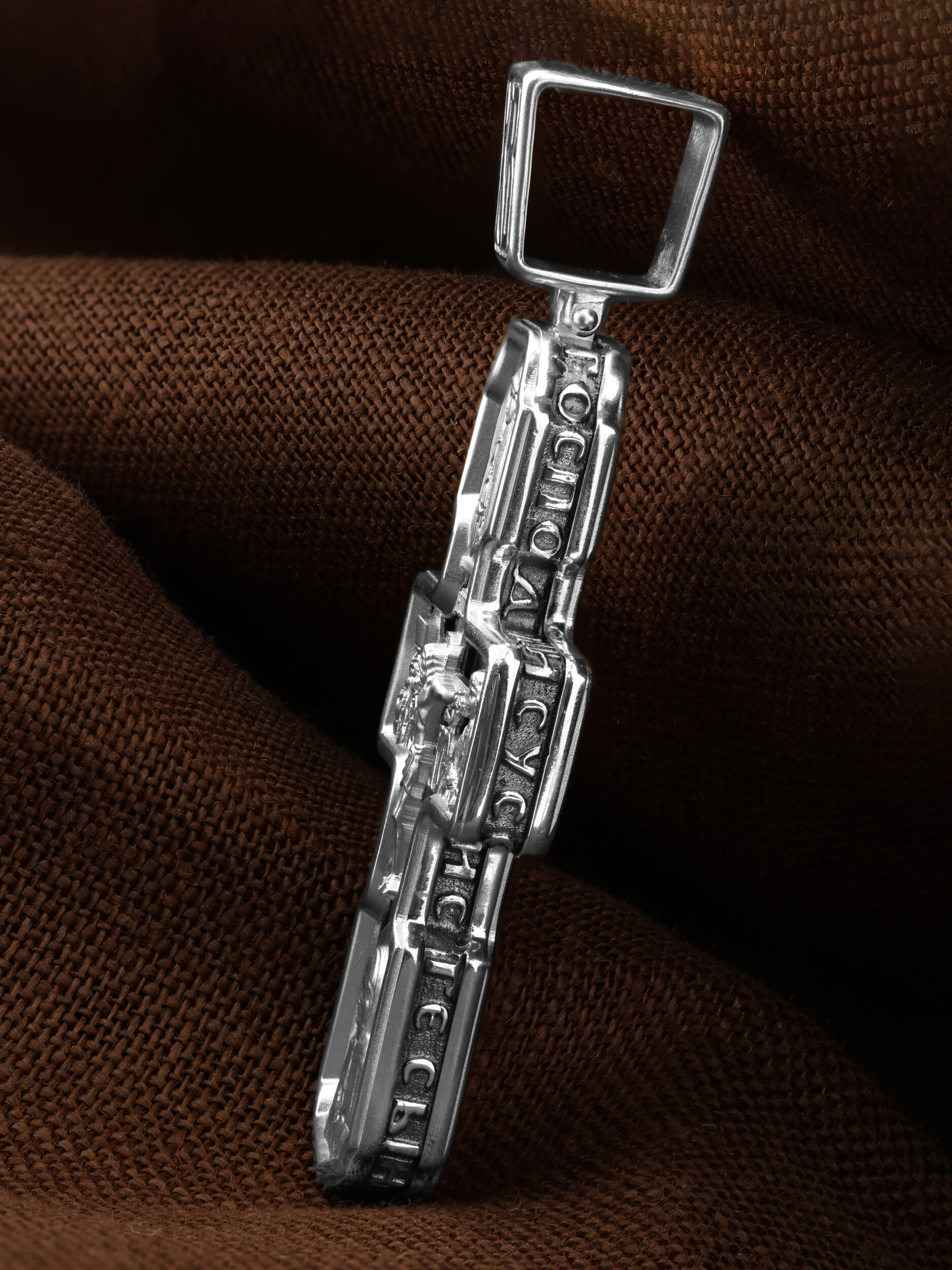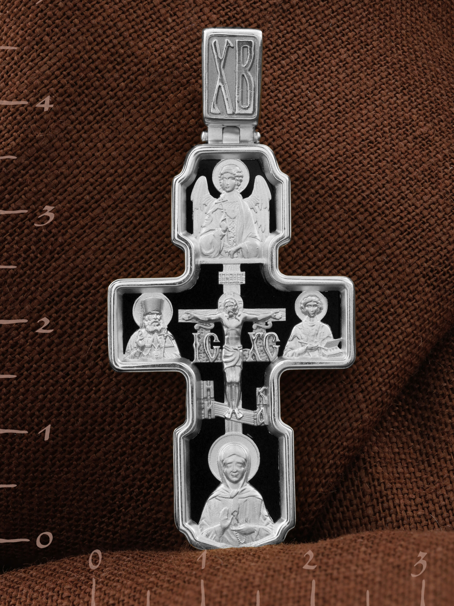 На лицевой стороне креста изображено Распятие Господа и Спасителя нашего Иисуса Христа. Христос, подвергнутый на кресте мучительной казни, своими страданиями искупил нас от древнего греха и даровал нам жизнь вечную. Без Распятия не было бы Воскресения Христова, и поэтому Крест из орудия казни обратился в святыню, в которой действует Благодать Божия. На верхней табличке, выше головы Иисуса, расположена надпись, составленная Понтием Пилатом на трех языках — «IНЦI». Она означает «Иисус Назорей, Царь Иудейский». Надпись «IС ХС» означает Иисус Христос и помещается на разных сторонах поперечной (большой) перекладины креста. На нижней перекладине находится надпись –«НИКА», что означает победитель. Над Распятием изображен Святой Ангел-Хранитель держащий крест в правой руке. Ниже Распятия — образ Святой блаженной старицы Матроны Московской. Справа — образ Свя¬того ве¬ли¬ко-му¬че¬ника и це¬ли¬теля Пан¬те¬ле¬и¬мона, а слева — образ Святителя Луки (Войно-Ясенецкого). На кулонном кольце находится надпись «ХВ», что означает Христос Воскрес. На торцевой стороне креста размещены слова Иисусовой молитвы: «Господи Иисусе Христе, Сыне Божий, помилуй мя, грешного».