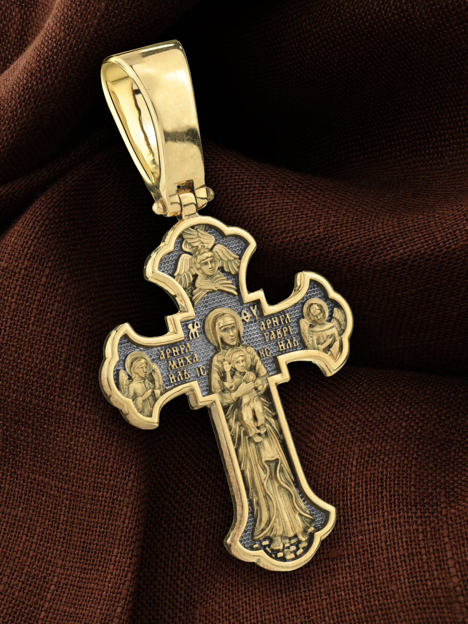 На обратной стороне креста в полный рост изображена Валаамская икона Божией Матери, над которой раскрыл свои крылья серафим. Этот образ написал в 1878 году иеромонах Валаамского монастыря о. Алипий. Валаамскую икону прославили многие чудеса, ее считают целительницей при разных недугах. Перед этим образом Богородицу молят в первую очередь об укреплении веры, просят даровать смирение, твердость в соблюдении заповедей Христовых и об исцелении. Богородице предстоят два архангела, Михаил и Гавриил.