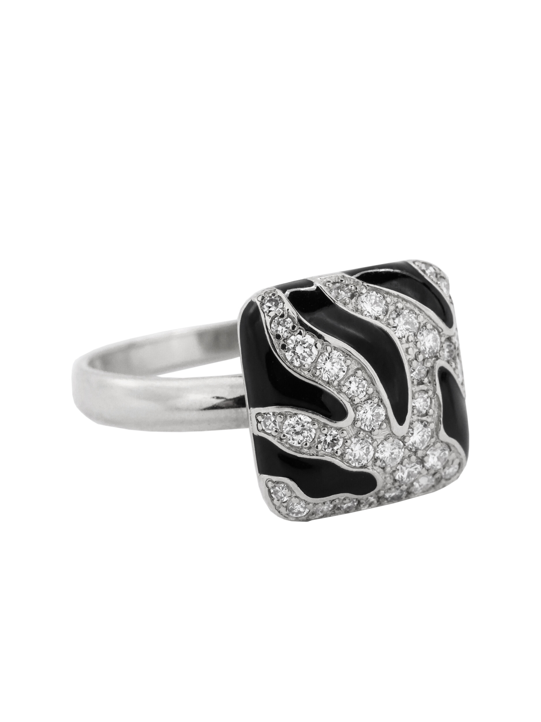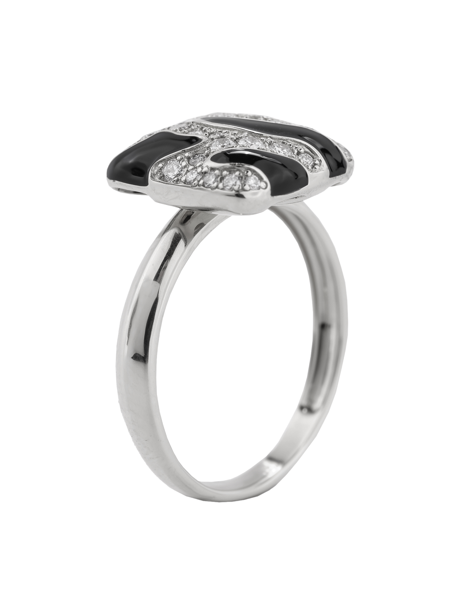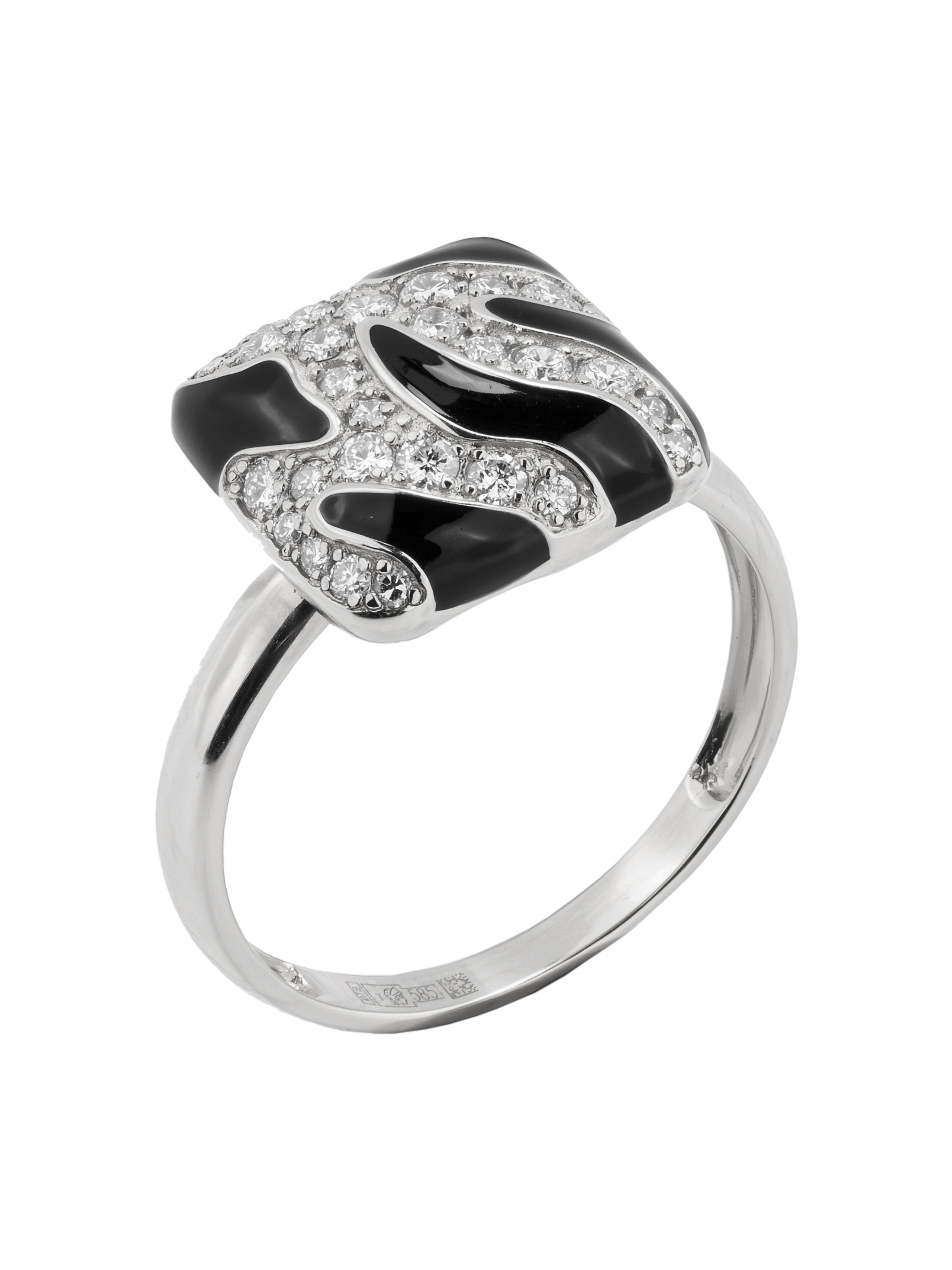 Композицию дополняют 34 сверкающих бриллианта круглой огранки, создавая завораживающую игру света на поверхности изделия. Белый цвет материала в сочетании с изысканными вставками черного и белого оттенков делает это кольцо универсальным акцентом как для женщин, так и для мужчин. Это украшение станет идеальным выбором для тех, кто предпочитает заметные и статусные аксессуары, способные подчеркнуть индивидуальность и безупречный вкус.