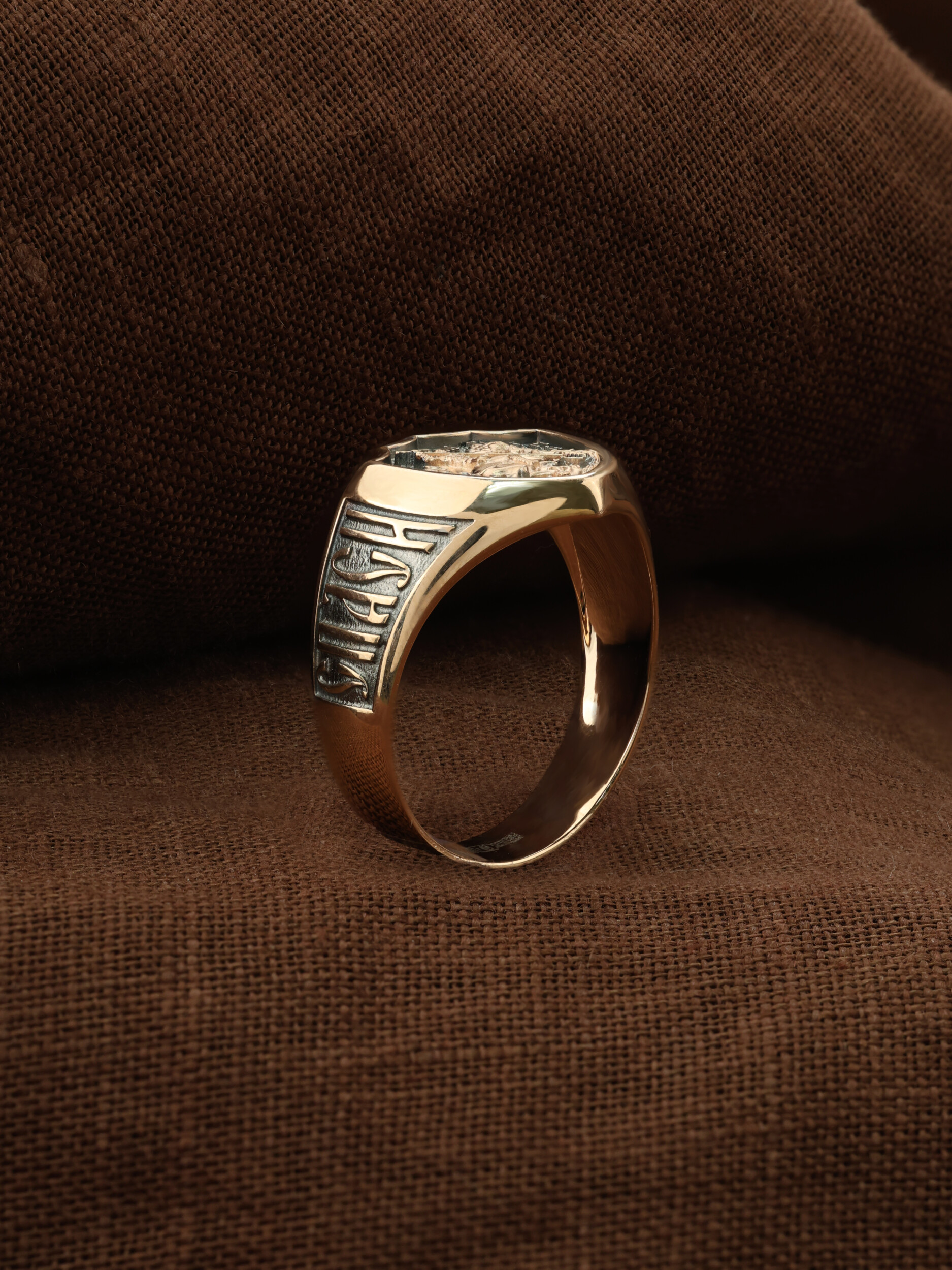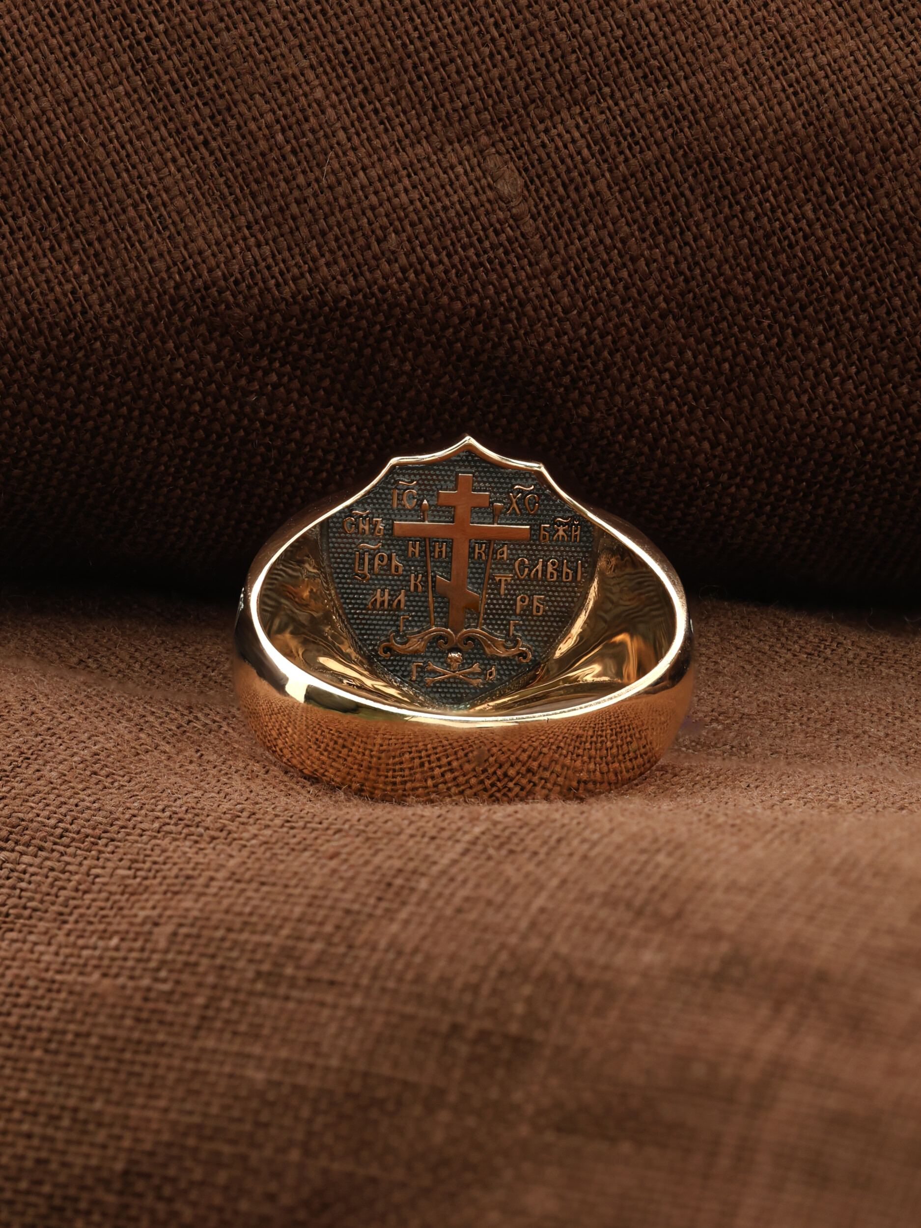 С внутренней стороны кольца изображен «Голгофский крест». Центральным и главным элементом композиции лицевой стороны является восьмиконечный крест — образ Честного и Животворящего Креста Господня, установленного на горе Голгофе. В основании креста изображена гора Голгофа, на которой был распят Спаситель и череп Адама, чьи кости по приданию омыла кровь Иисуса Христа. Перед головой располагаются лежащие кости рук, изображаются правая на левой, как при погребении или причащении. В XVI веке на Руси около изображения Голгофы появились обозначения «М.Л.Р.Б.» — Место Лобное Рай Бысть (Голгофа в переводе с еврейского — Лобное место). Чуть ниже справа и слева буквы «Г.Г.» — гора Голгофа.