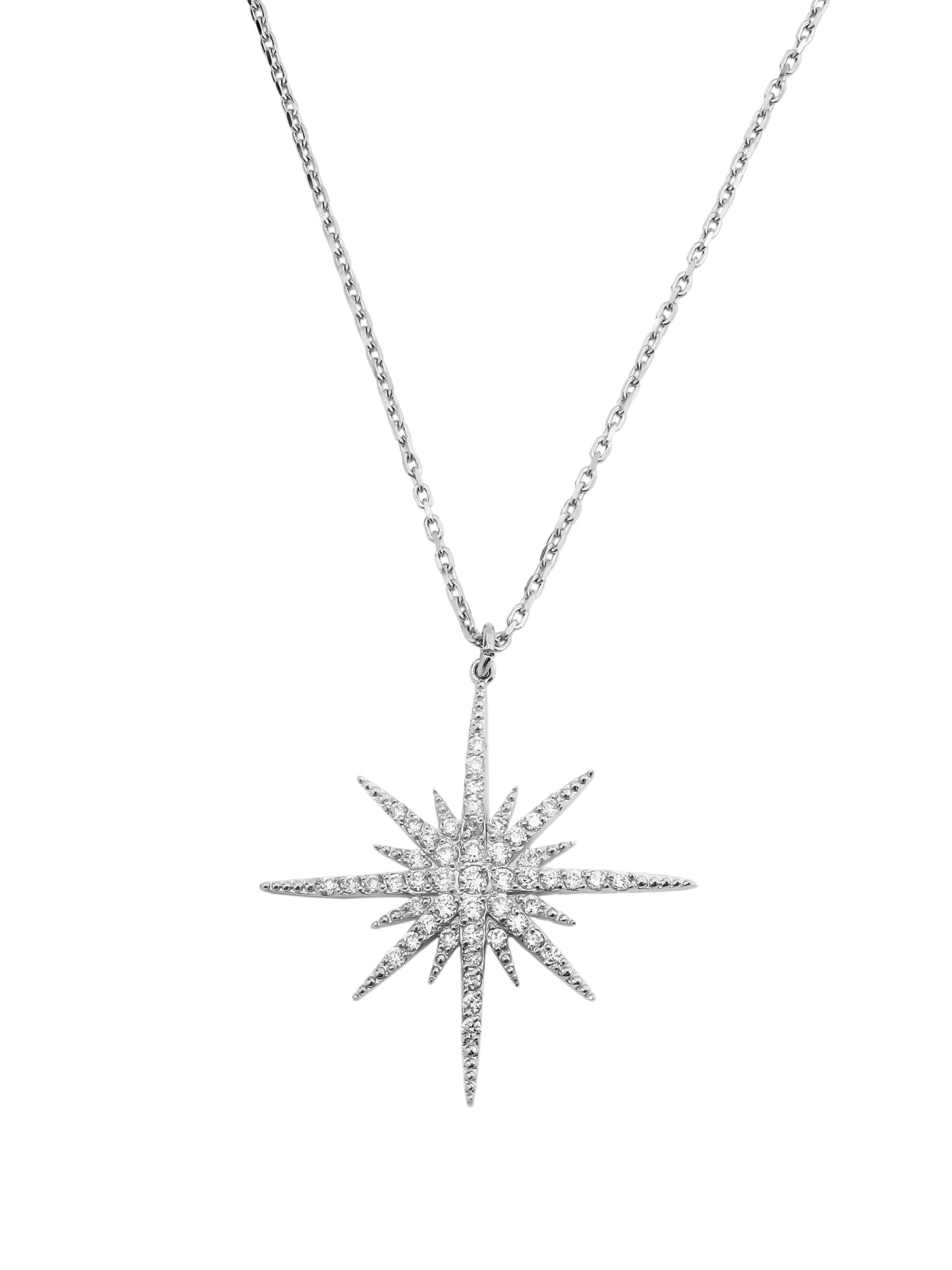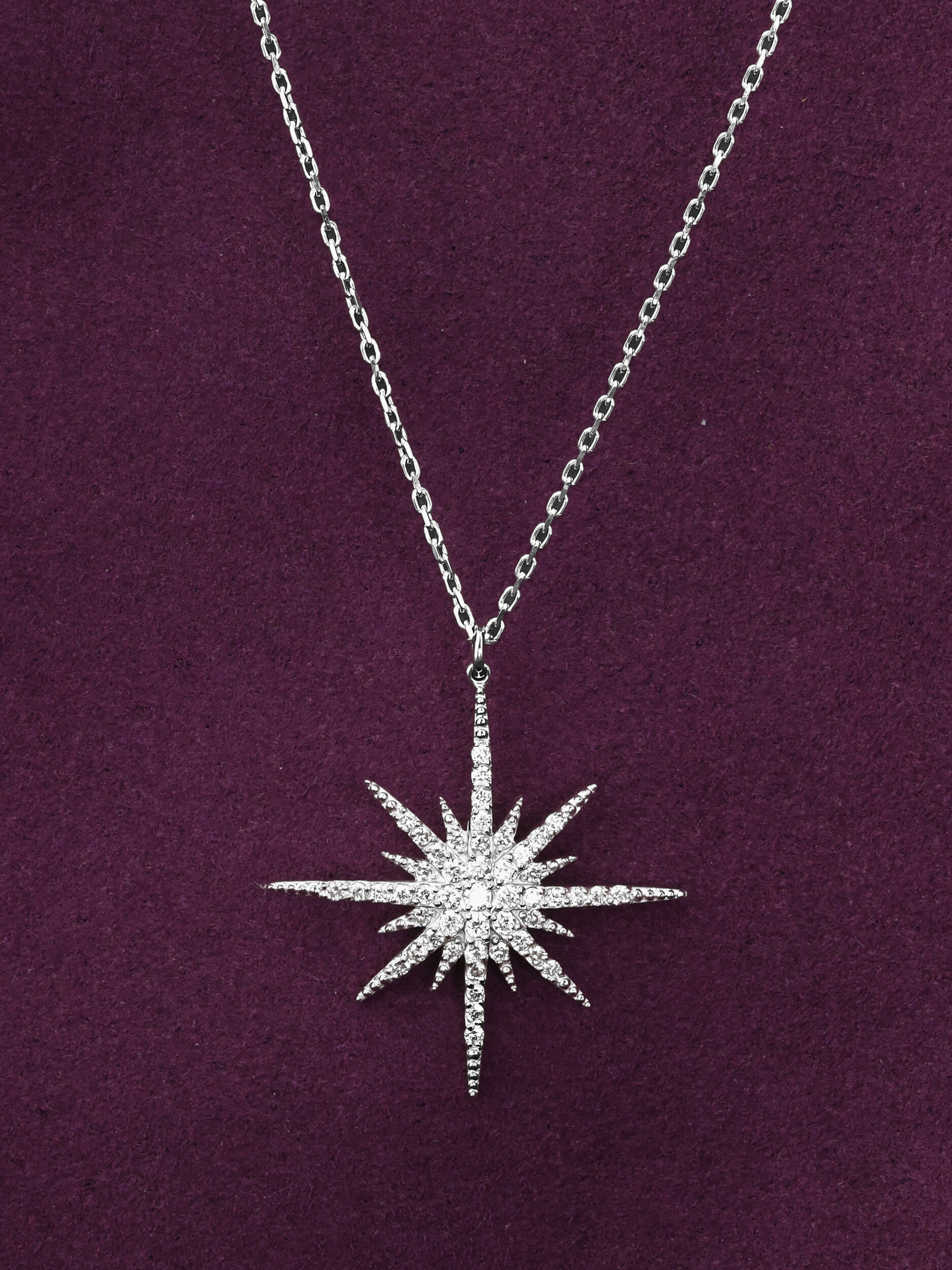 Изысканное колье из белого золота 585 пробы станет центральным акцентом вашего образа, привнося в него нотки аристократизма и утонченности. Дизайн изделия, вдохновленный небесными светилами, воплощает в себе эстетику коллекции De Luxe Бриллианты — Galaxy. Центральный элемент колье выполнен в форме многогранной звезды, которая завораживает своим сиянием и мастерством исполнения.