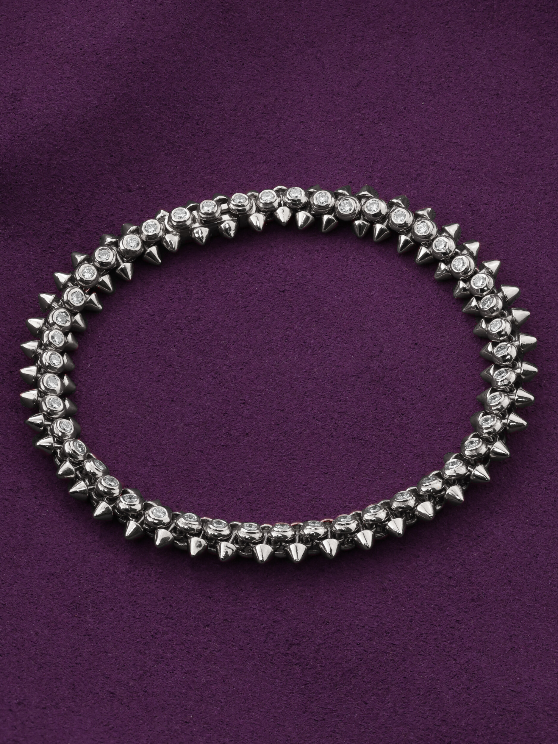 Мы предлагаем данную модель в широкой размерной сетке, включающей варианты 16, 16.5, 17, 17.5, 18, 18.5 и 19. Выберите идеальный размер, чтобы браслет комфортно сидел на руке и радовал своим сиянием каждый день. Это украшение создано для тех, кто ценит сочетание классических материалов, таких как белое золото, и провокационных дизайнерских решений, воплощенных в форме шипов и множестве сияющих бриллиантов.