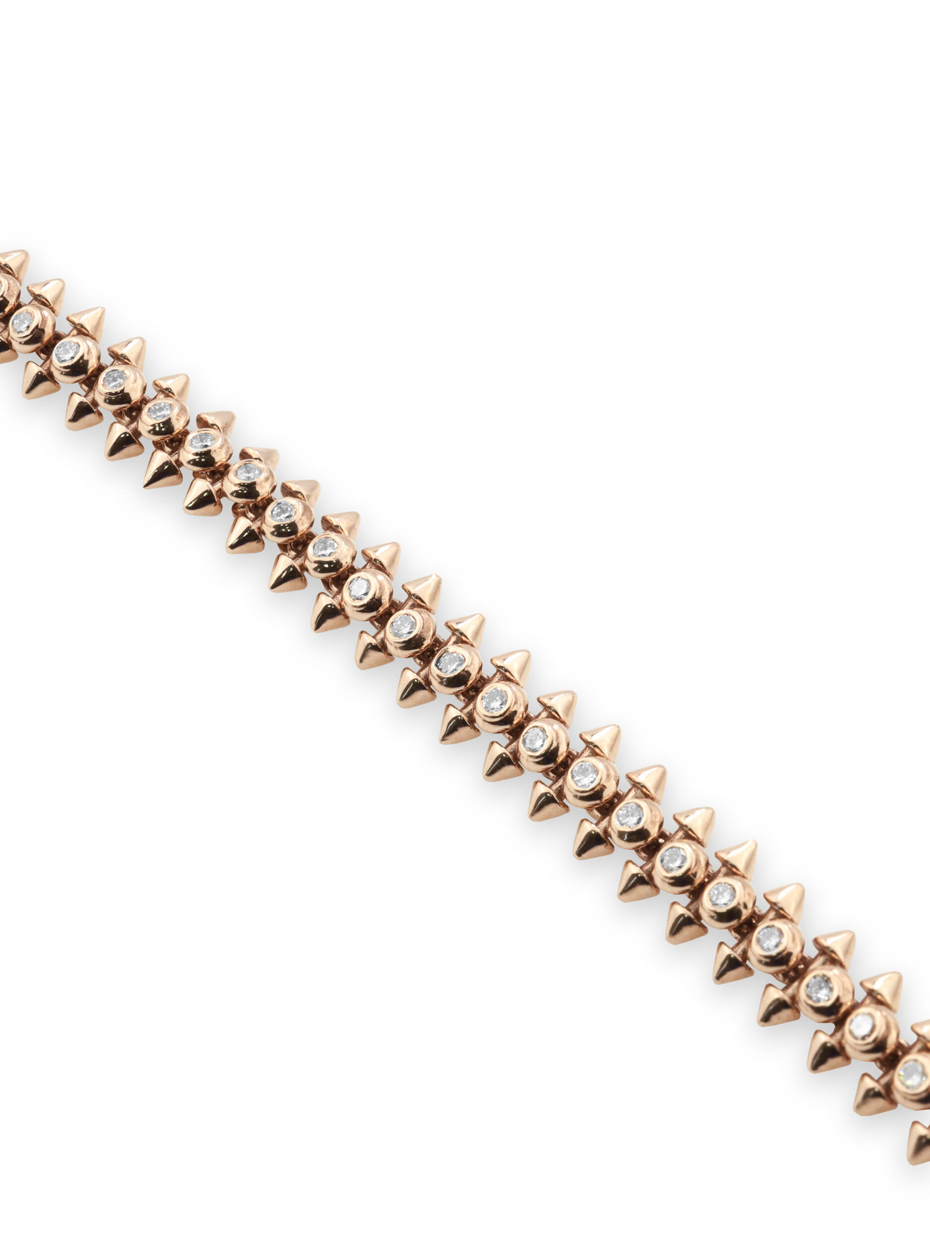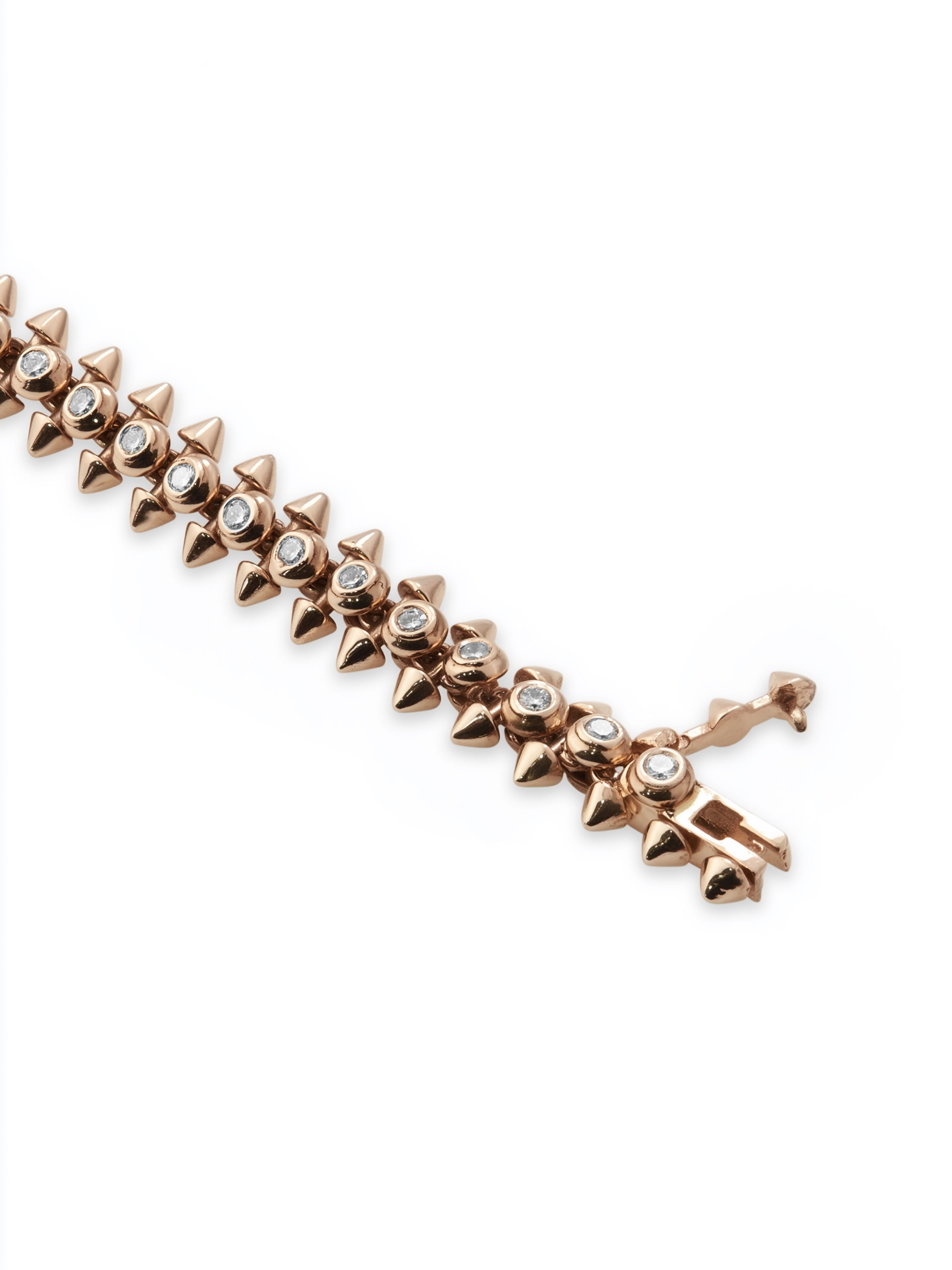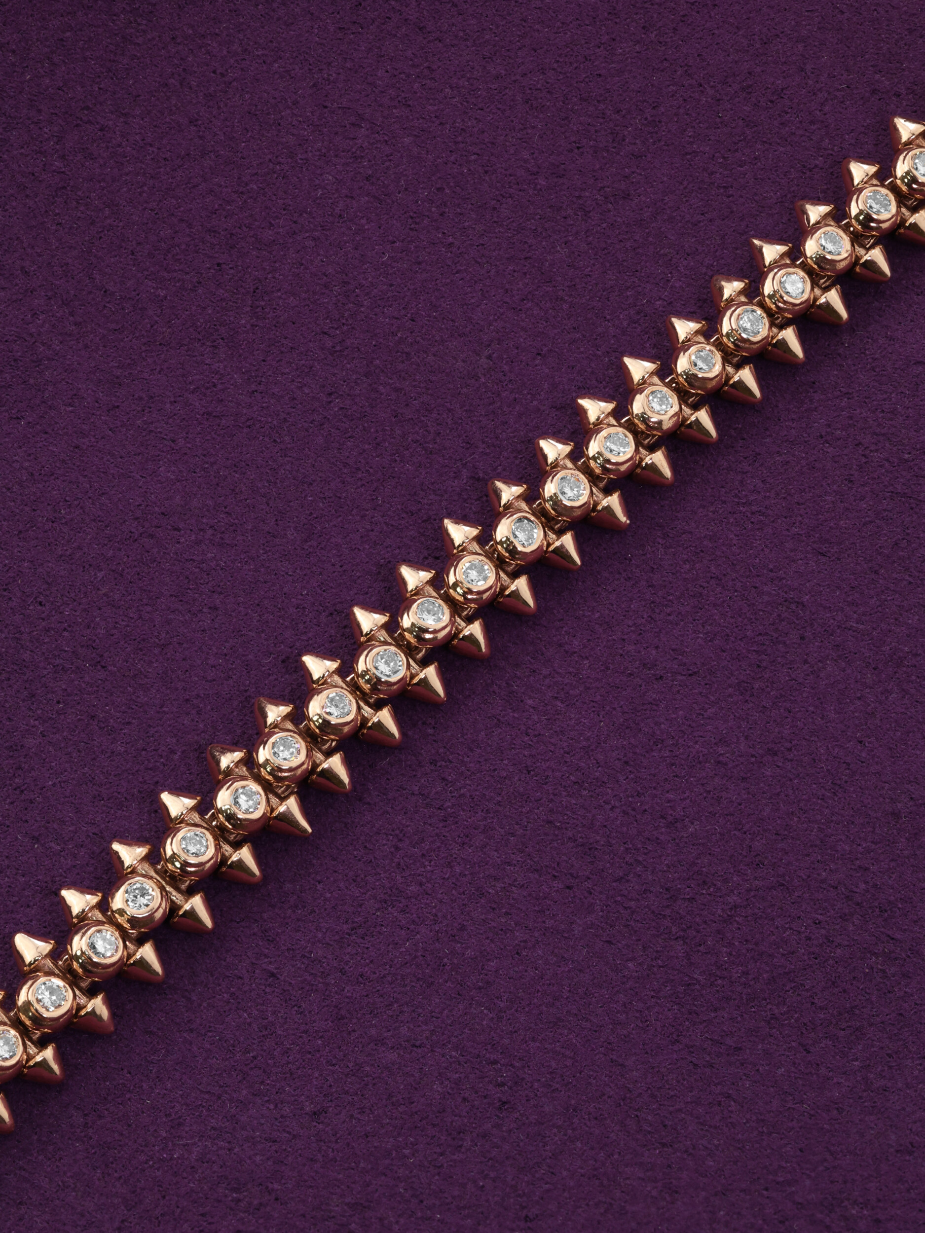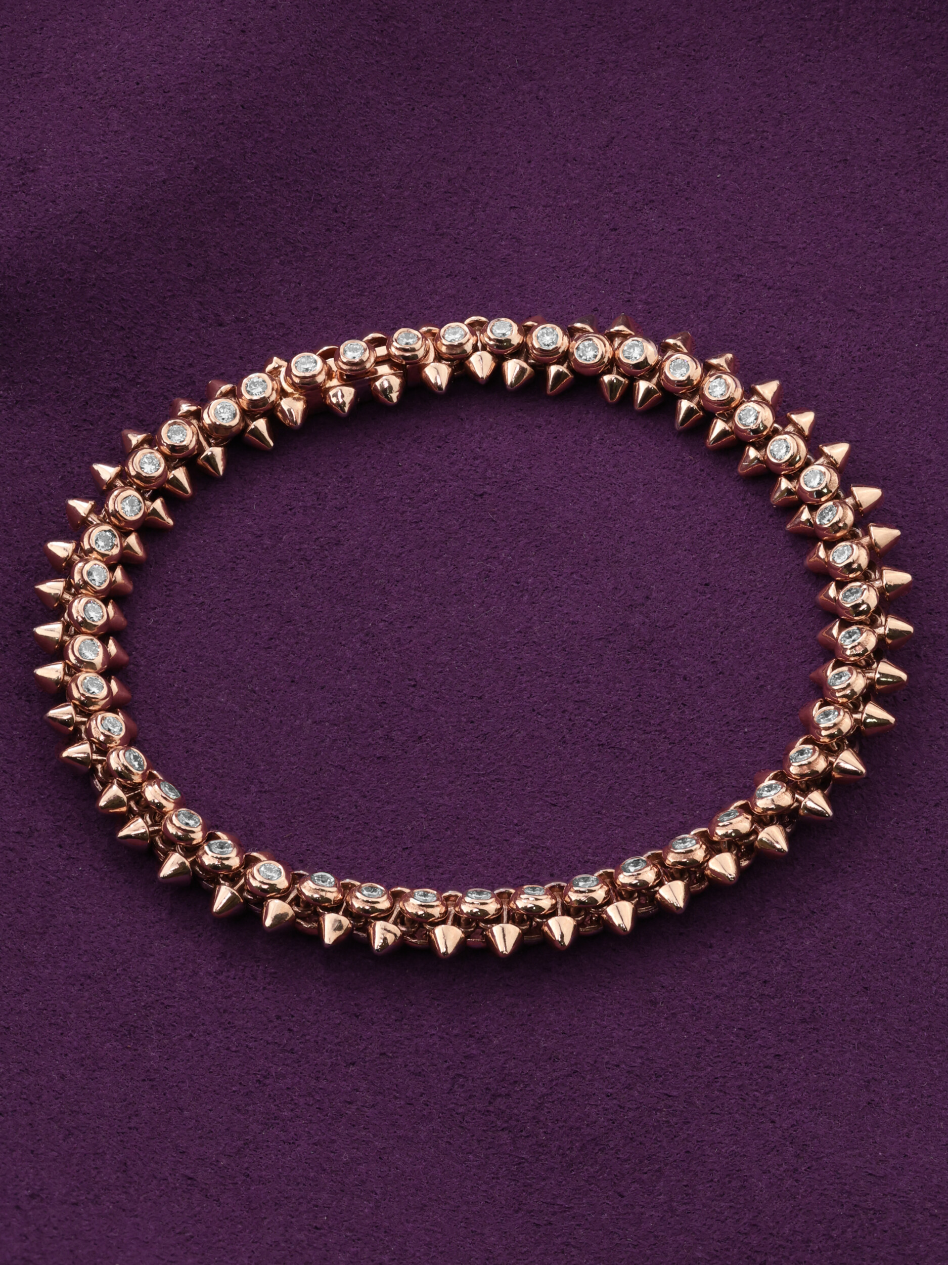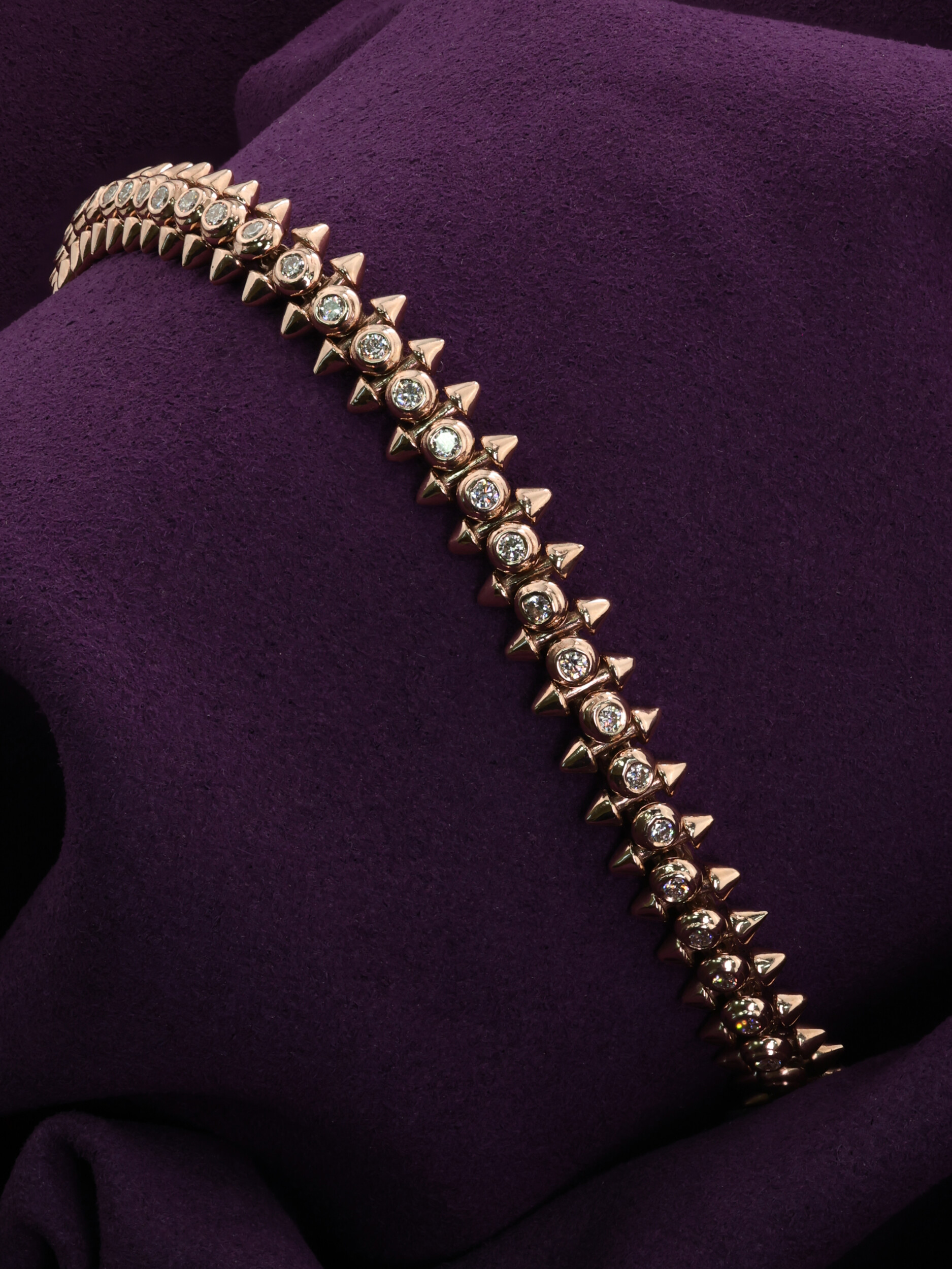 Роскошный браслет из красного золота 585 пробы из коллекции De Luxe — Дерзость — это украшение для тех, кто не боится заявлять о себе. Дизайн изделия сочетает в себе дерзость и утонченную элегантность, где центральным декоративным элементом выступают акцентные шипы, придающие образу характер и выразительность. Этот аксессуар станет идеальным дополнением вашего стиля, подчеркивая индивидуальность и уверенность в себе.
