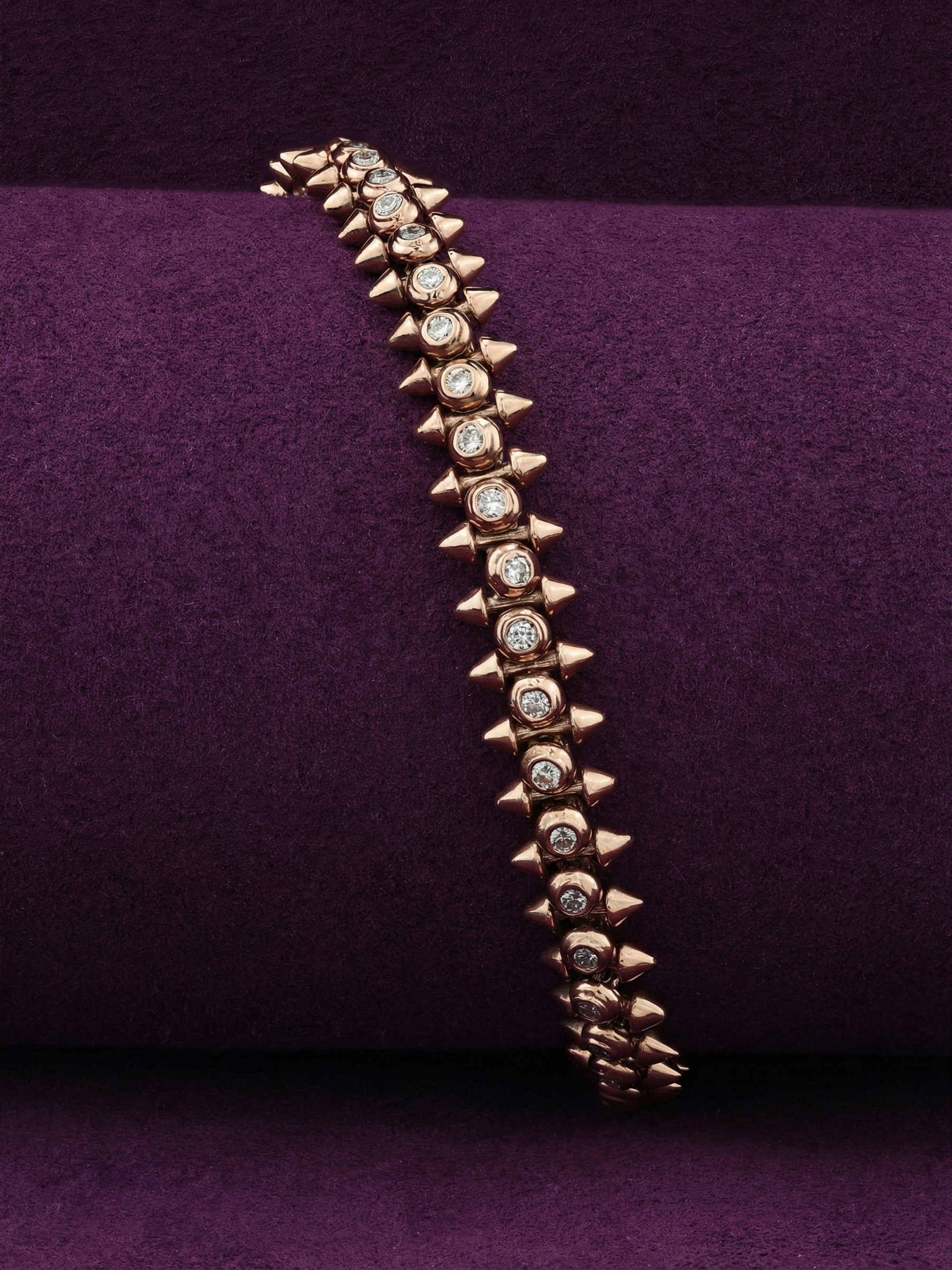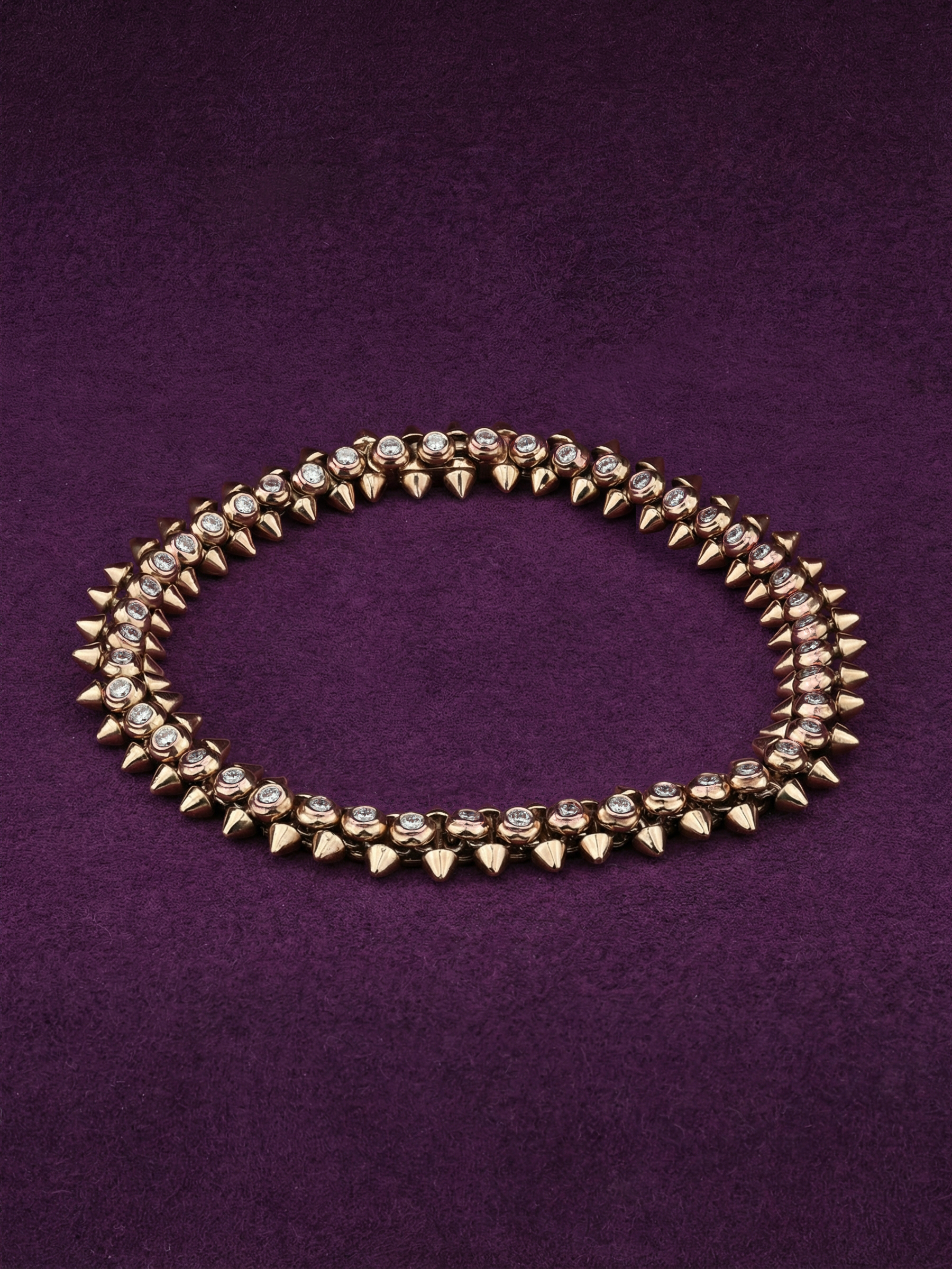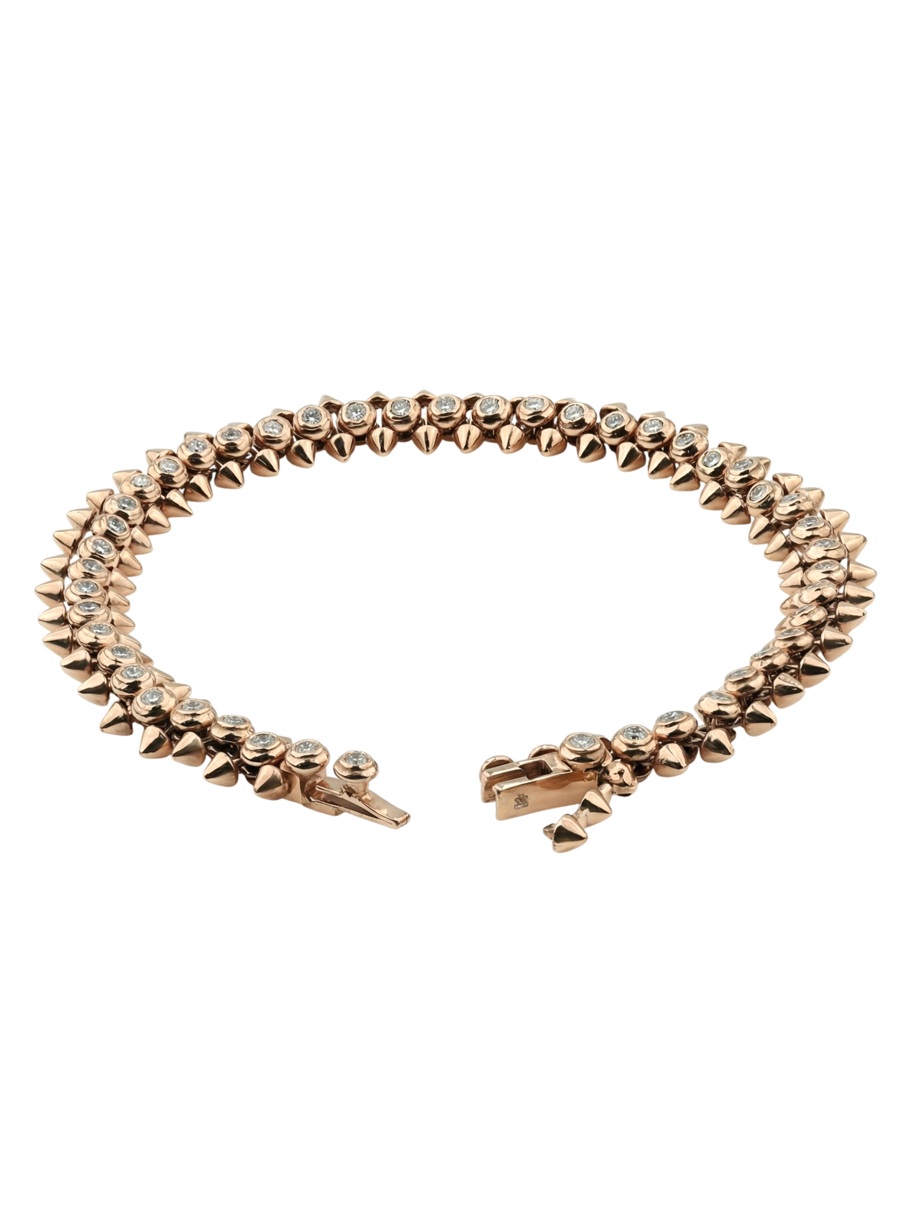 Представляем вашему вниманию эффектный браслет из коллекции De Luxe — Дерзость, созданный для тех, кто предпочитает смелые и выразительные украшения. Это ювелирное изделие выполнено из высококачественного розового золота 585 пробы, чей нежный оттенок придает металлу особую мягкость и благородство. Основной акцент дизайна — дерзкие шипы, которые придают украшению современный и динамичный характер, превращая его в яркий аксессуар как для женщин, так и для мужчин.